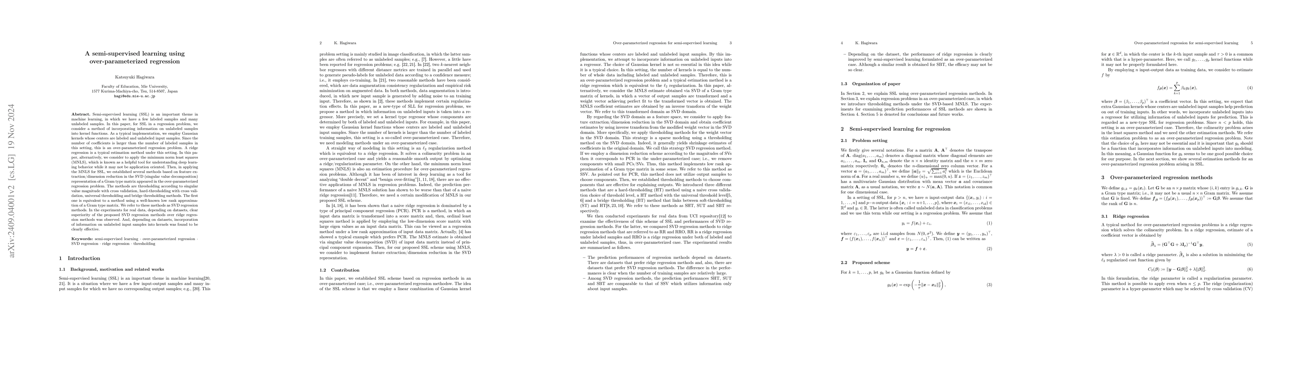 The paper proposes a semi-supervised learning (SSL) scheme using over-parameterized regression methods, incorporating kernel functions with both labeled and unlabeled input samples. Several methods based on the Minimum Norm Least Squares (MNLS) approach are examined, including Singular Value Thresholding (SVT), Hard-thresholding with Cross Validation (SHT), Universal Thresholding (SUT), and Bridge Thresholding (SBT).