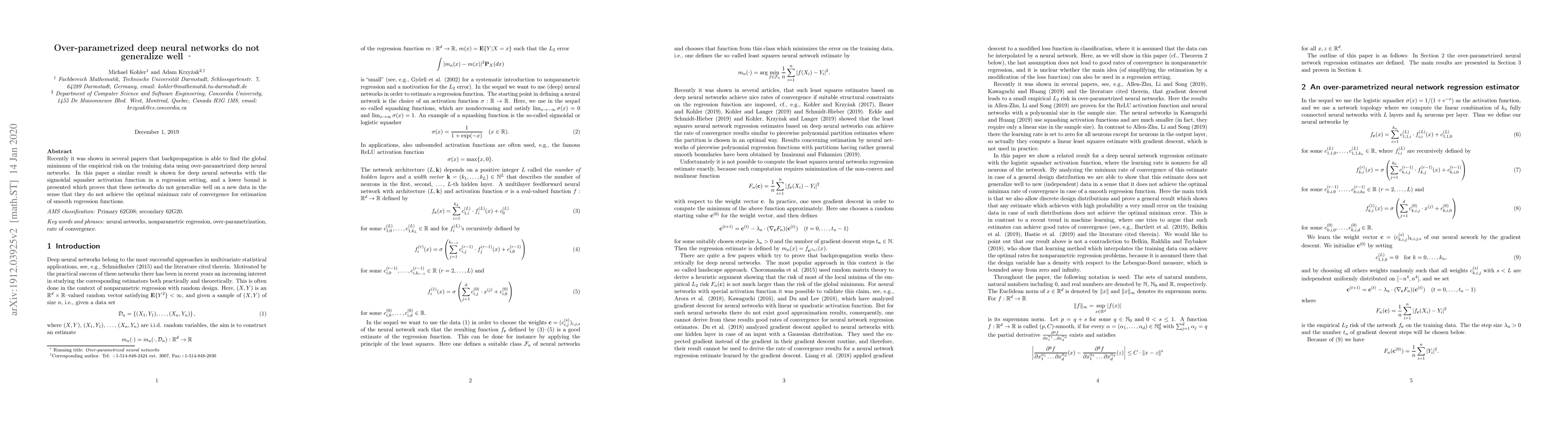 This paper demonstrates that despite over-parametrized deep neural networks with sigmoidal activation functions achieving the global minimum on training data, they fail to generalize well, not reaching the optimal minimax rate for estimating new smooth regression functions.