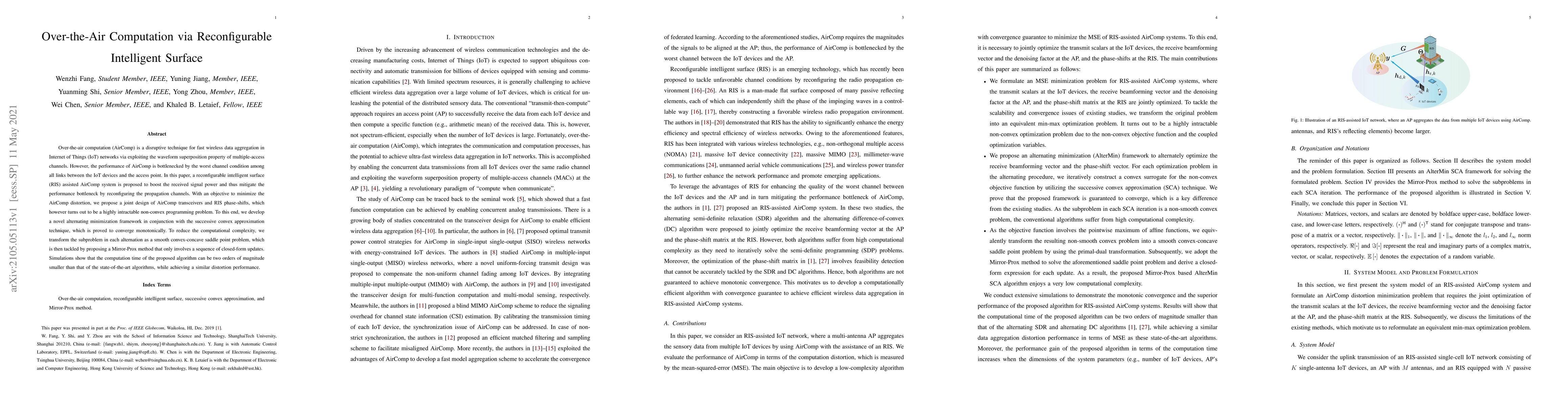 This paper proposes a reconfigurable intelligent surface (RIS) assisted over-the-air computation (AirComp) system to enhance wireless data aggregation in IoT networks. It introduces an alternating minimization framework to solve the non-convex optimization problem, achieving significant reduction in computational complexity while maintaining performance.