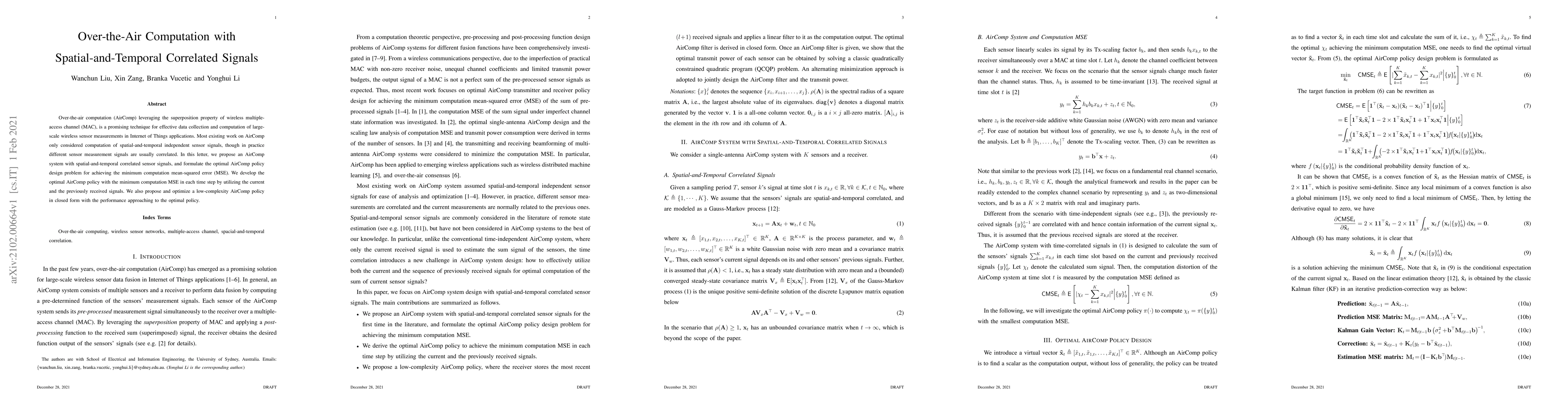 This paper proposes an over-the-air computation system for correlated sensor signals in IoT applications, addressing the challenge of spatial-and-temporal correlations. It develops an optimal policy to minimize computation mean-squared error and a low-complexity alternative with near-optimal performance.