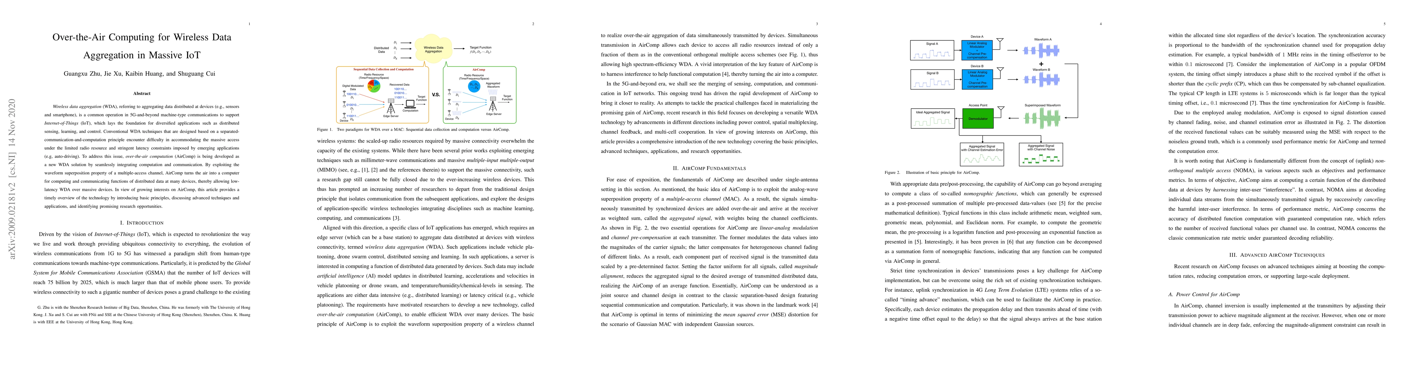 Wireless data aggregation (WDA), referring to aggregating data distributed at devices (e.g., sensors and smartphone), is a common operation in 5G-and-beyond machine-type communications to support Internet-of-Things (IoT), which lays the foundation for diversified applications such as distributed sensing, learning, and control. Conventional WDA techniques that are designed based on a separated-communication-and-computation principle encounter difficulty in accommodating the massive access under the limited radio resource and stringent latency constraints imposed by emerging applications (e.g, auto-driving). To address this issue, over-the-air computation (AirComp) is being developed as a new WDA solution by seamlessly integrating computation and communication. By exploiting the waveform superposition property of a multiple-access channel, AirComp turns the air into a computer for computing and communicating functions of distributed data at many devices, thereby allowing low-latency WDA over massive devices. In view of growing interests on AirComp, this article provides a timely overview of the technology by introducing basic principles, discussing advanced techniques and applications, and identifying promising research opportunities.