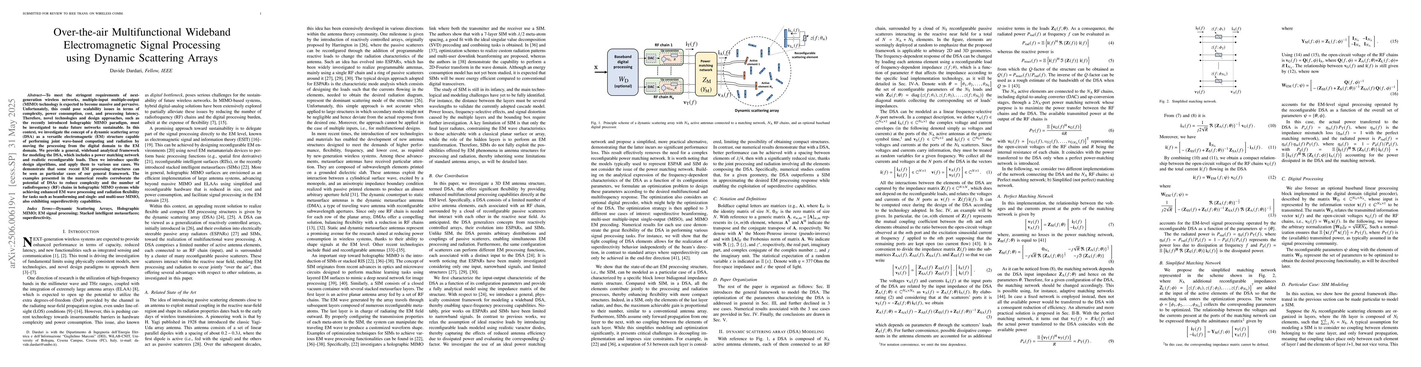 The research introduces a dynamic scattering array (DSA) as a wideband analytical framework for electromagnetic (EM) signal processing, incorporating power matching networks and reconfigurable loads. Specific design algorithms are then applied to various use cases.