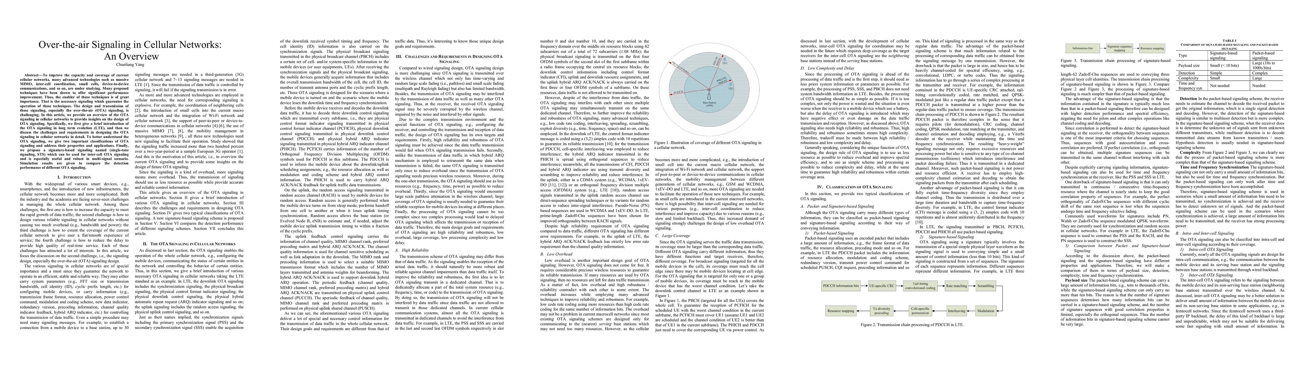 To improve the capacity and coverage of current cellular networks, many advanced technologies such as massive MIMO, inter-cell coordination, small cells, device-to-device communications, and so on, are under studying. Many proposed techniques have been shown to offer significant performance improvement. Thus, the enabler of those techniques is of great importance. That is the necessary signaling which guarantee the operation of those techniques. The design and transmission of those signaling, especially the over-the-air (OTA) signaling, is challenging. In this article, we provide an overview of the OTA signaling in cellular networks to provide insights on the design of OTA signaling. Specifically, we first give a brief introduction of the OTA signaling in long term evolution (LTE), and then we discuss the challenges and requirements in designing the OTA signaling in cellular networks in detail. To better understand the OTA signaling, we give two important classifications of OTA signaling and address their properties and applications. Finally, we propose a signature-based signaling named (single-tone signaling, STS) which can be used for inter-cell OTA signaling and is especially useful and robust in multi-signal scenario. Simulation results are given to compare the detection performance of different OTA signaling.