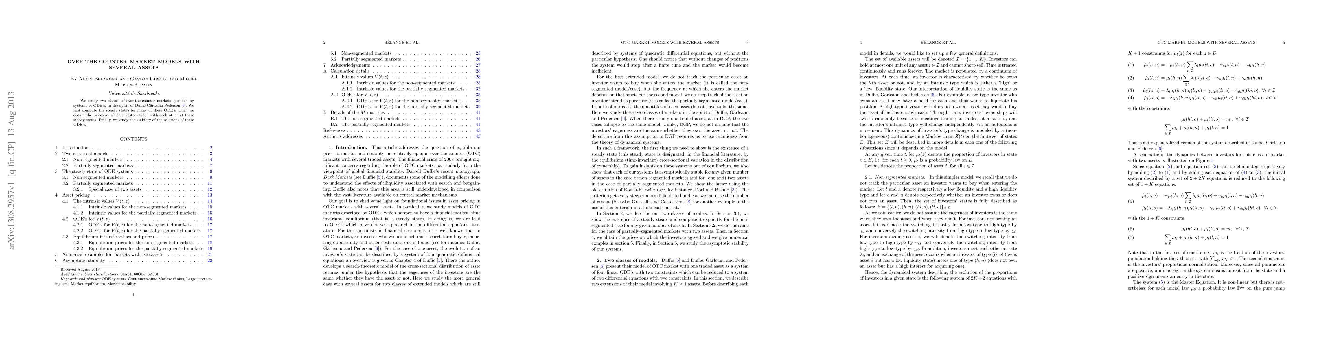 We study two classes of over-the-counter markets specified by systems of ODE's, in the spirit of Duffie-Garleanu-Pedersen, Econometrica, 2005. We first compute the steady states for many of these ODE's. Then we obtain the prices at which investors trade with each other at these steady states. Finally, we study the stability of the solutions of these ODE's.