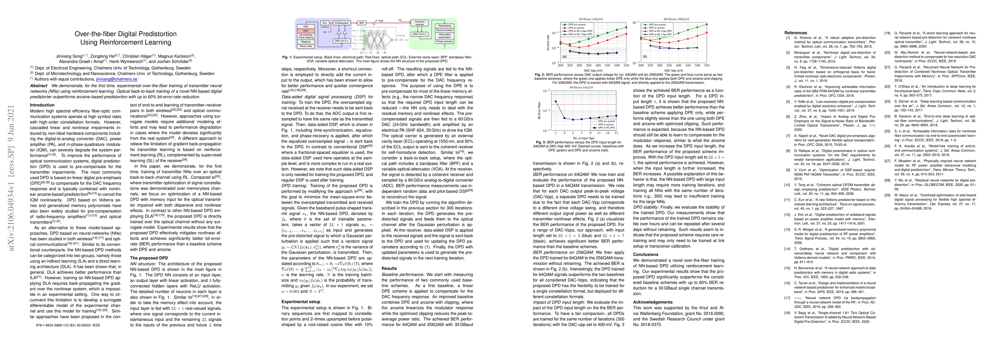 We demonstrate, for the first time, experimental over-the-fiber training of transmitter neural networks (NNs) using reinforcement learning. Optical back-to-back training of a novel NN-based digital predistorter outperforms arcsine-based predistortion with up to 60\% bit-error-rate reduction.