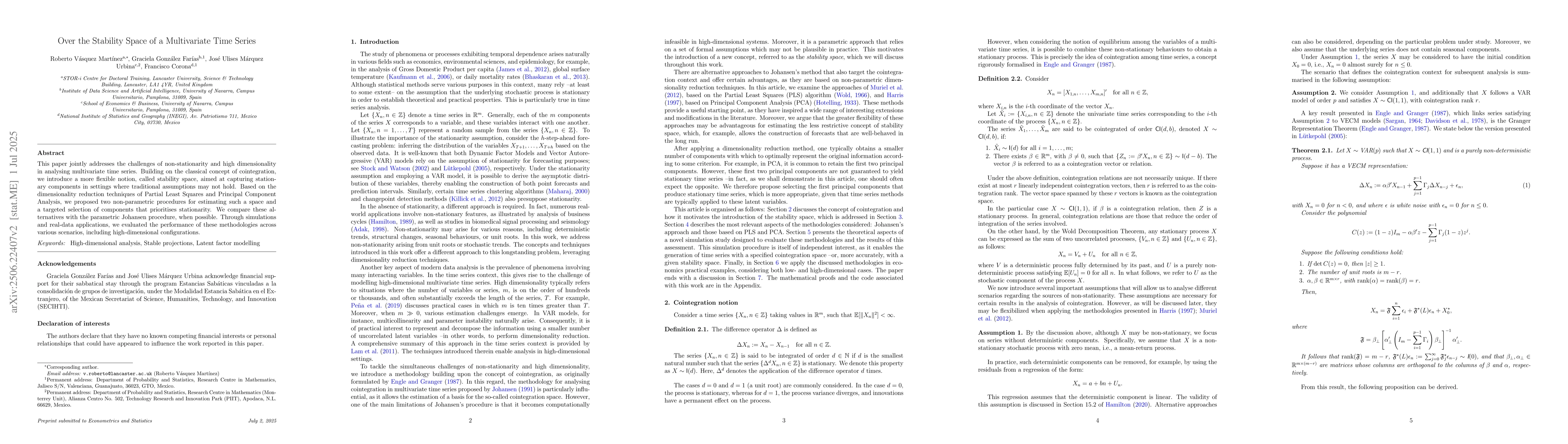 This paper jointly addresses the challenges of non-stationarity and high dimensionality in analysing multivariate time series. Building on the classical concept of cointegration, we introduce a more flexible notion, called stability space, aimed at capturing stationary components in settings where traditional assumptions may not hold. Based on the dimensionality reduction techniques of Partial Least Squares and Principal Component Analysis, we proposed two non-parametric procedures for estimating such a space and a targeted selection of components that prioritises stationarity. We compare these alternatives with the parametric Johansen procedure, when possible. Through simulations and real-data applications, we evaluated the performance of these methodologies across various scenarios, including high-dimensional configurations.