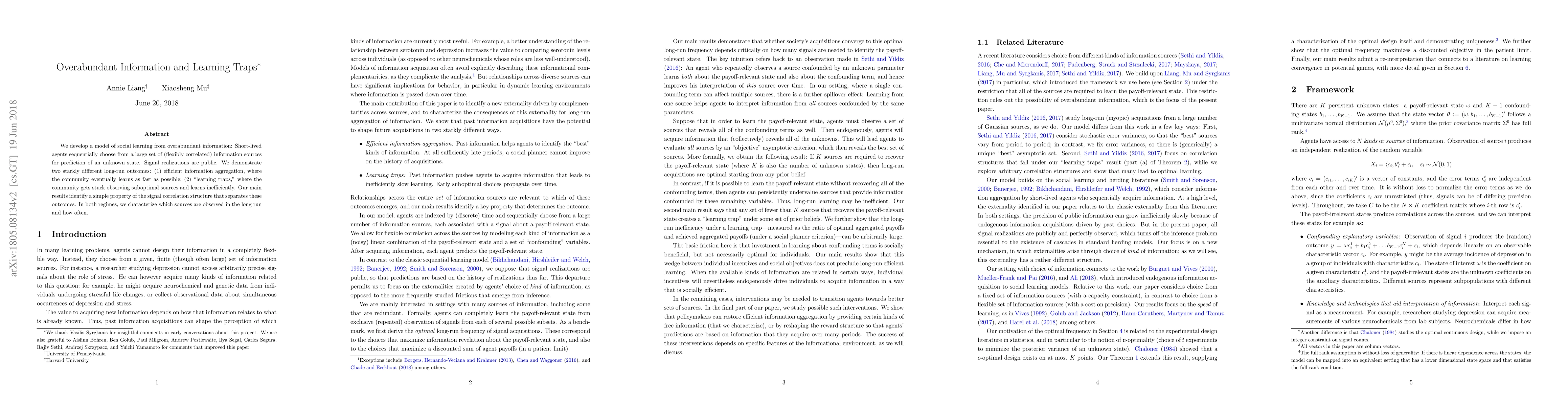 We develop a model of social learning from overabundant information: Short-lived agents sequentially choose from a large set of (flexibly correlated) information sources for prediction of an unknown state. Signal realizations are public. We demonstrate two starkly different long-run outcomes: (1) efficient information aggregation, where the community eventually learns as fast as possible; (2) "learning traps," where the community gets stuck observing suboptimal sources and learns inefficiently. Our main results identify a simple property of the signal correlation structure that separates these outcomes. In both regimes, we characterize which sources are observed in the long run and how often.