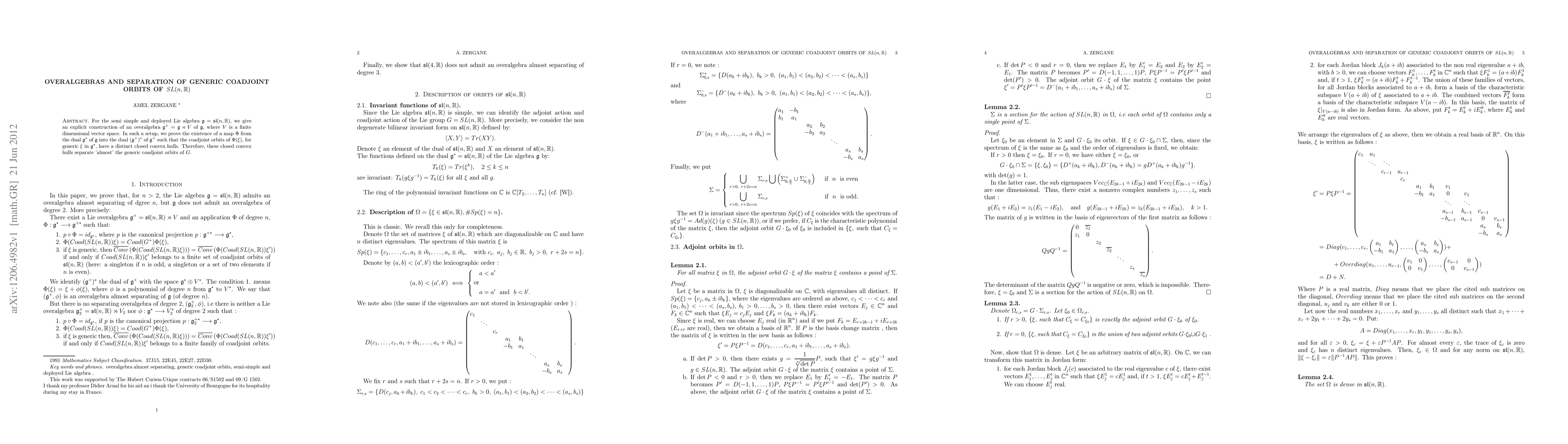 For the semi simple and deployed Lie algebra $\mathfrak g=\mathfrak{sl}(n, \R)$, we give an explicit construction of an overalgebra $\mathfrak g^+=\mathfrak g\rtimes V$ of $\mathfrak g$, where $V$ is a finite dimensional vector space. In such a setup, we prove the existence of a map $\Phi$ from the dual $\mathfrak g^\star$ of $\mathfrak g$ into the dual $(\mathfrak g^+)^\star$ of $\mathfrak g^+$ such that the coadjoint orbits of $\Phi(\xi)$, for generic $\xi$ in $\mathfrak g^\star$, have a distinct closed convex hulls. Therefore, these closed convex hulls separate 'almost' the generic coadjoint orbits of $G$.