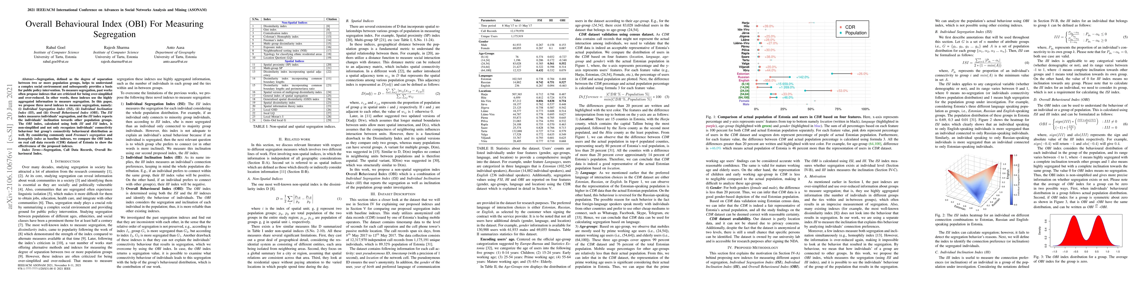 Segregation, defined as the degree of separation between two or more population groups, helps to understand a complex social environment and subsequently provides a basis for public policy intervention. To measure segregation, past works often propose indexes that are criticized for being over-simplified and over-reduced. In other words, these indexes use the highly aggregated information to measure segregation. In this paper, we propose three novel indexes to measure segregation, namely: (i) Individual Segregation Index (ISI), (ii) Individual Inclination Index (III), and (iii) Overall Behavioural Index (OBI). The ISI index measures individuals' segregation, and the III index reports the individuals' inclination towards other population groups. The OBI index, calculated using both III and ISI index, is non-simplified and not only recognizes individuals' connectivity behaviour but group's connectivity behavioural distribution as well. By considering commonly used Freeman's segregation and homophily index as baseline indexes, we compare the OBI index on real call data records (CDR) dataset of Estonia to show the effectiveness of the proposed indexes.