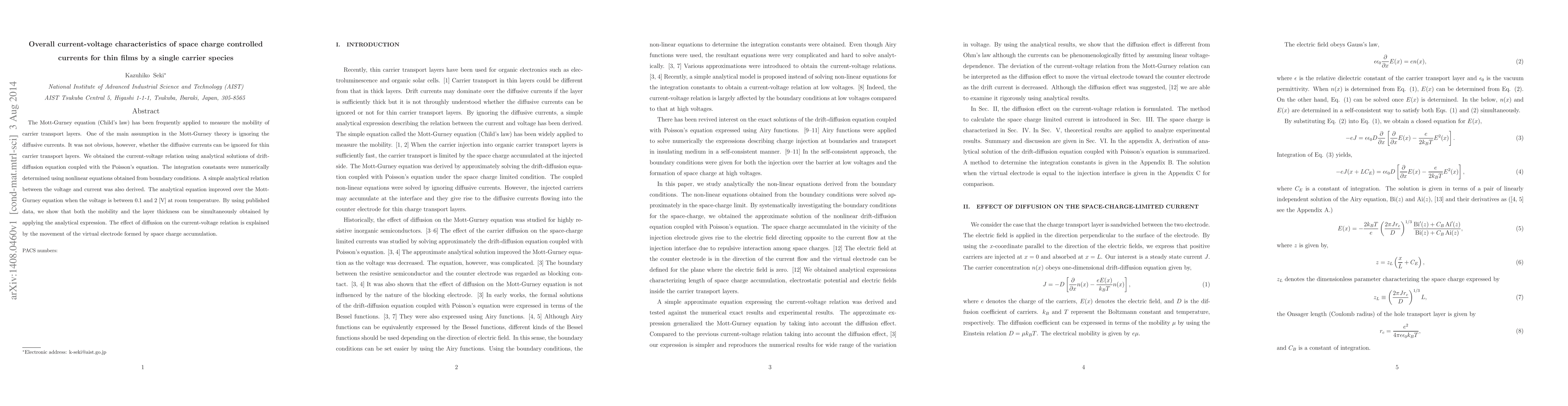 The Mott-Gurney equation (Child's law) has been frequently applied to measure the mobility of carrier transport layers. One of the main assumption in the Mott-Gurney theory is ignoring the diffusive currents. It was not obvious, however, whether the diffusive currents can be ignored for thin carrier transport layers. We obtained the current-voltage relation using analytical solutions of drift-diffusion equation coupled with the Poisson's equation. The integration constants were numerically determined using nonlinear equations obtained from boundary conditions.A simple analytical relation between the voltage and current was also derived. The analytical equation improved over the Mott-Gurney equation when the voltage is between 0.1 and 2 [V] at room temperature. By using published data, we show that both the mobility and the layer thickness can be simultaneously obtained by applying the analytical expression. The effect of diffusion on the current-voltage relation is explained by the movement of the virtual electrode formed by space charge accumulation.