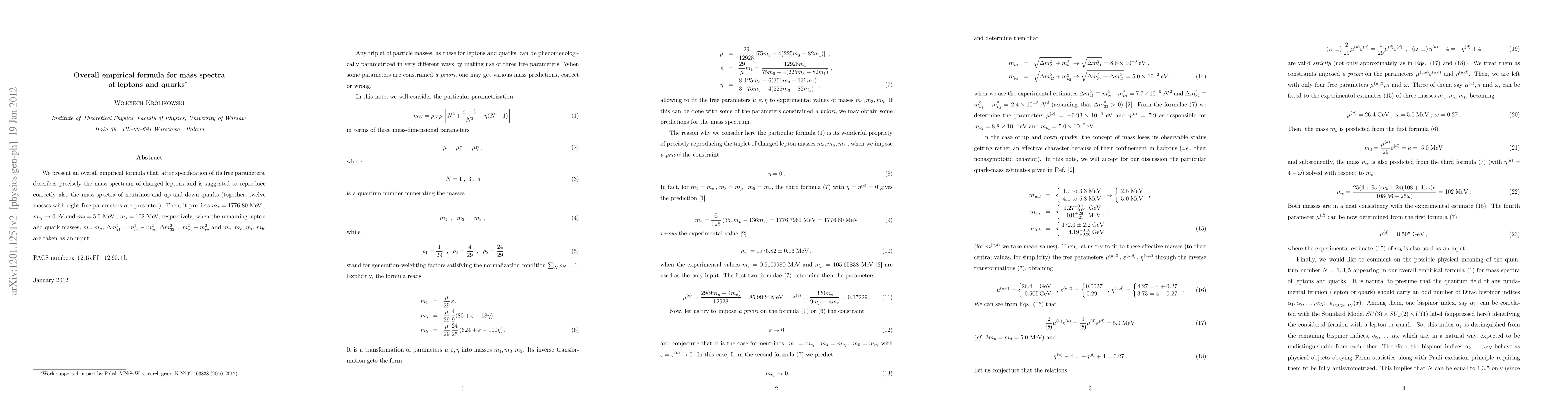 We present an overall empirical formula that, after specification of its free parameters, describes precisely the mass spectrum of charged leptons and is suggested to reproduce correctly also the mass spectra of neutrinos and up and down quarks (together, twelve masses with eight free parameters are presented). Then, it predicts m_tau = 1776.80 MeV, m_{nu_1} -> 0 eV and m_d = 5.0 MeV, $m_s = 102 MeV, respectively, when the remaining lepton and quark masses, m_e, m_mu, Delta m^2_{21} = m^2_{nu_2}-m^2_{nu_1}, Delta m^2_{32} = m^2_{nu_3}-m^2_{nu_2} and m_u, m_c, m_t, m_b, are taken as an input.