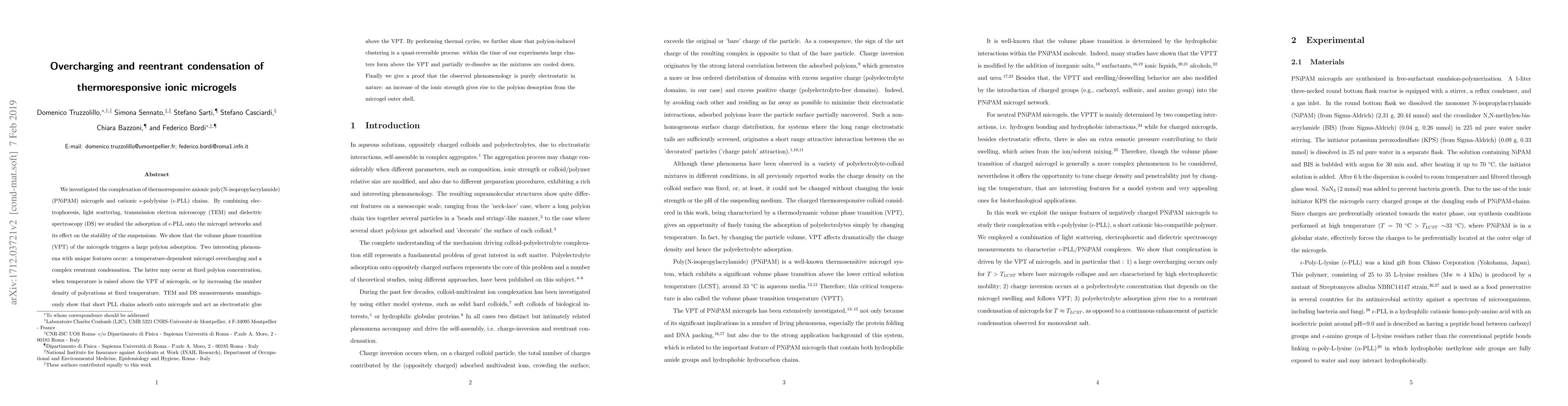 We investigated the complexation of thermoresponsive anionic poly(N-isopropylacrylamide) (PNiPAM) microgels and cationic $\epsilon$-polylysine ($\epsilon$-PLL) chains. By combining electrophoresis, light scattering, transmission electron microscopy (TEM) and dielectric spectroscopy (DS) we studied the adsorption of $\epsilon$-PLL onto the microgel networks and its effect on the stability of the suspensions. We show that the volume phase transition (VPT) of the microgels triggers a large polyion adsorption. Two interesting phenomena with unique features occur: a temperature-dependent microgel overcharging and a complex reentrant condensation. The latter may occur at fixed polyion concentration, when temperature is raised above the VPT of microgels, or by increasing the number density of polycations at fixed temperature. TEM and DS measurements unambiguously show that short PLL chains adsorb onto microgels and act as electrostatic glue above the VPT. By performing thermal cycles, we further show that polyion-induced clustering is a quasi-reversible process: within the time of our experiments large clusters form above the VPT and partially re-dissolve as the mixtures are cooled down. Finally we give a proof that the observed phenomenology is purely electrostatic in nature: an increase of the ionic strength gives rise to the polyion desorption from the microgel outer shell.