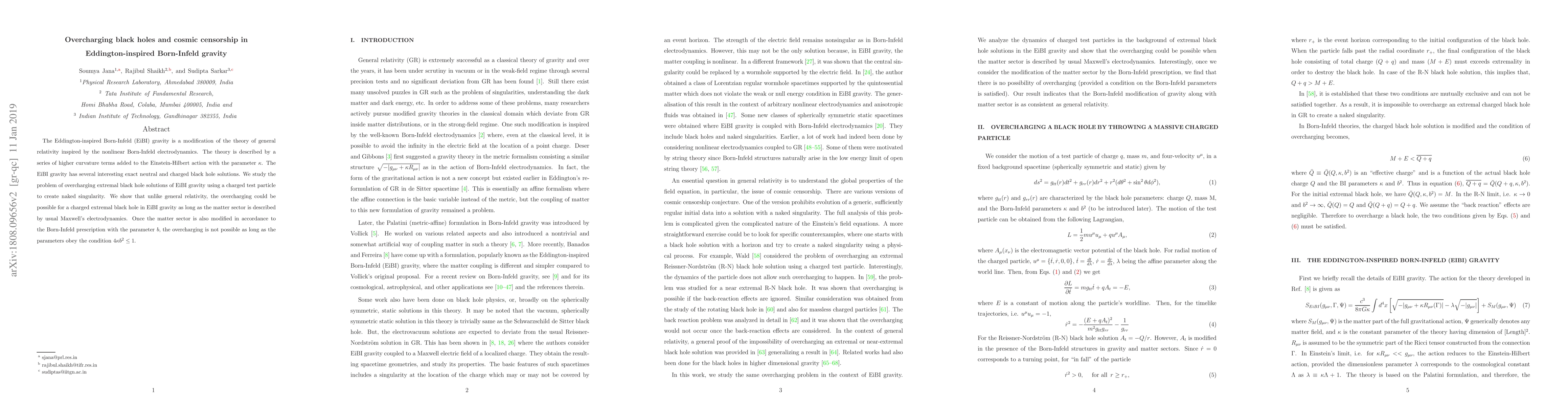 This paper investigates overcharging in extremal black holes within Eddington-inspired Born-Infeld (EiBI) gravity, demonstrating that overcharging can occur unlike in general relativity, unless the electrodynamics is also modified with Born-Infeld parameters under specific conditions.