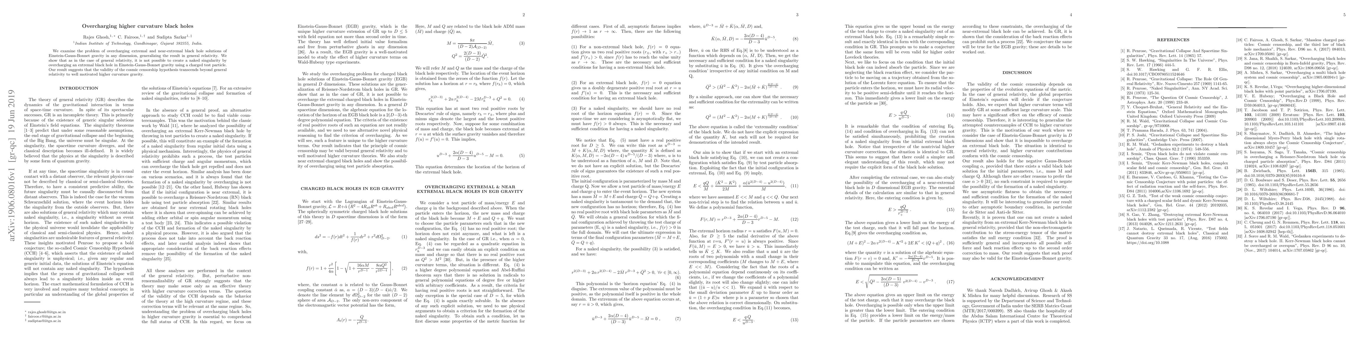 This paper investigates the overcharging of extremal and near-extremal black holes in Einstein-Gauss-Bonnet gravity, demonstrating that it is not possible to create a naked singularity by overcharging, thus extending the cosmic censorship hypothesis to higher curvature gravity theories.