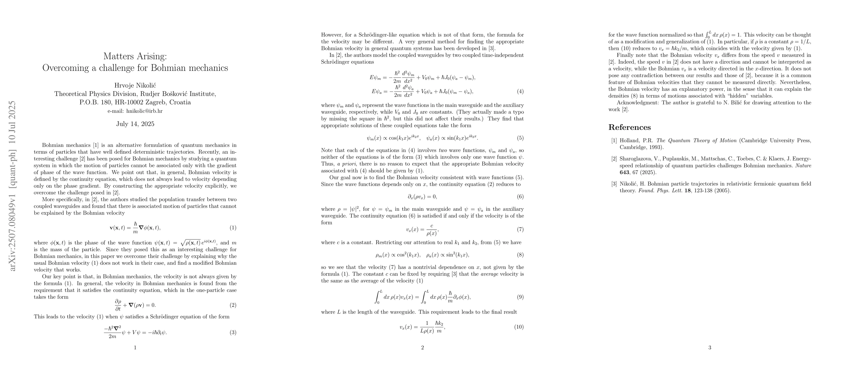 Recently, Bohmian mechanics has been challenged [Nature 643, 67 (2025)] by studying a system in which the motion of particles cannot be associated only with the gradient of phase of the wave function. We point out that, in general, Bohmian velocity is defined by the continuity equation, which does not always lead to velocity depending only on the phase gradient. By constructing the appropriate velocity explicitly, we overcome the challenge.