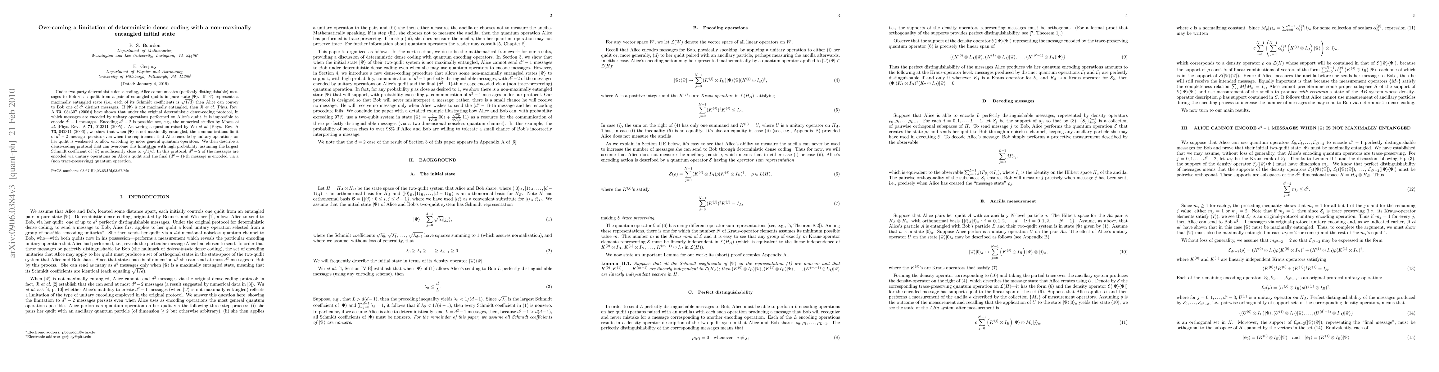 Under two-party deterministic dense-coding, Alice communicates (perfectly distinguishable) messages to Bob via a qudit from a pair of entangled qudits in pure state |Psi>. If |Psi> represents a maximally entangled state (i.e., each of its Schmidt coefficients is sqrt(1/d)), then Alice can convey to Bob one of d^2 distinct messages. If |Psi> is not maximally entangled, then Ji et al. [Phys. Rev. A 73, 034307 (2006)] have shown that under the original deterministic dense-coding protocol, in which messages are encoded by unitary operations performed on Alice's qudit, it is impossible to encode d^2-1 messages. Encoding d^2-2 is possible; see, e.g., the numerical studies by Mozes et al. [Phys. Rev. A 71, 012311 (2005)]. Answering a question raised by Wu et al. [Phys. Rev. A 73, 042311 (2006)], we show that when |Psi> is not maximally entangled, the communications limit of d^2-2 messages persists even when the requirement that Alice encode by unitary operations on her qudit is weakened to allow encoding by more general quantum operators. We then describe a dense-coding protocol that can overcome this limitation with high probability, assuming the largest Schmidt coefficient of |Psi> is sufficiently close to sqrt(1/d). In this protocol, d^2-2 of the messages are encoded via unitary operations on Alice's qudit, and the final (d^2-1)-th message is encoded via a (non-trace-preserving) quantum operation.