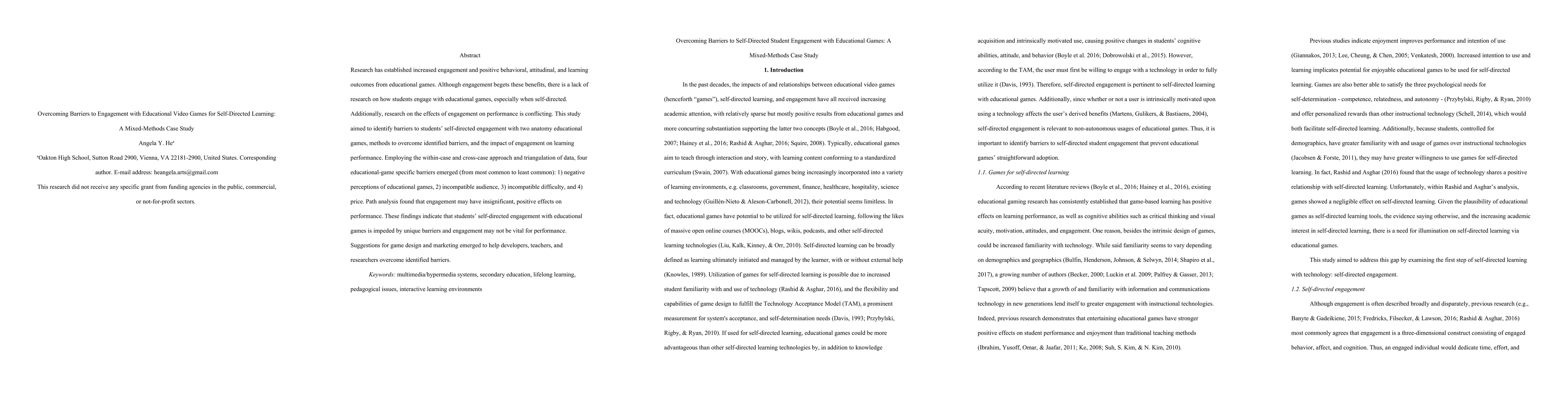 This study identifies barriers to students' self-directed engagement with educational video games, including negative perceptions, audience mismatch, difficulty mismatch, and cost. The research suggests that while engagement can positively affect learning, it may not be crucial for performance, offering insights for game developers and educators.