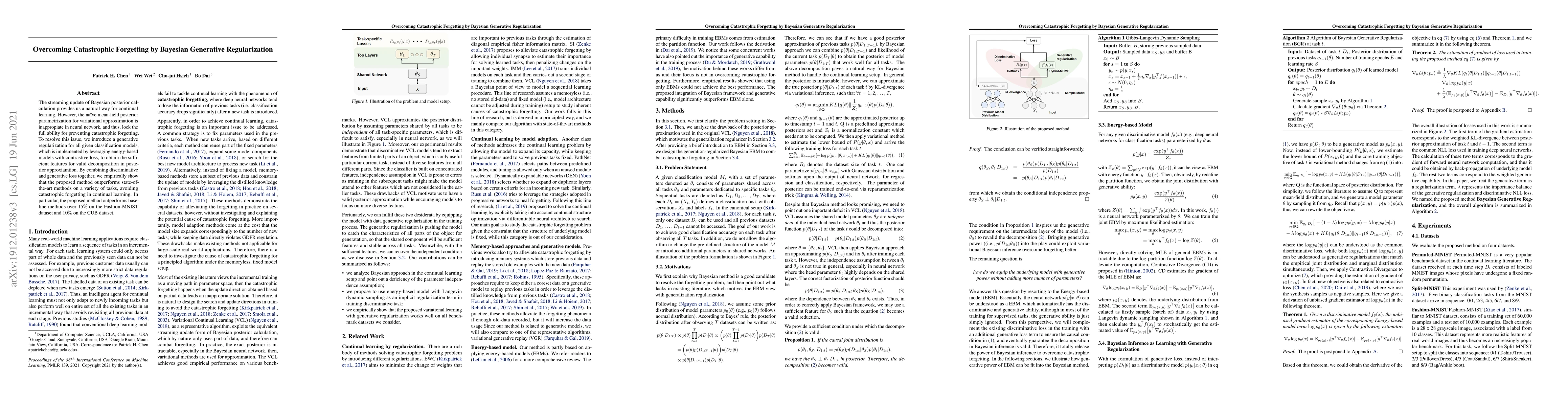 This paper introduces a generative regularization method within a Bayesian inference framework to tackle catastrophic forgetting in continual learning. The approach combines discriminative and generative losses, demonstrating superior performance over state-of-the-art methods, notably improving results by 15% on Fashion-MNIST and 10% on CUB datasets.
