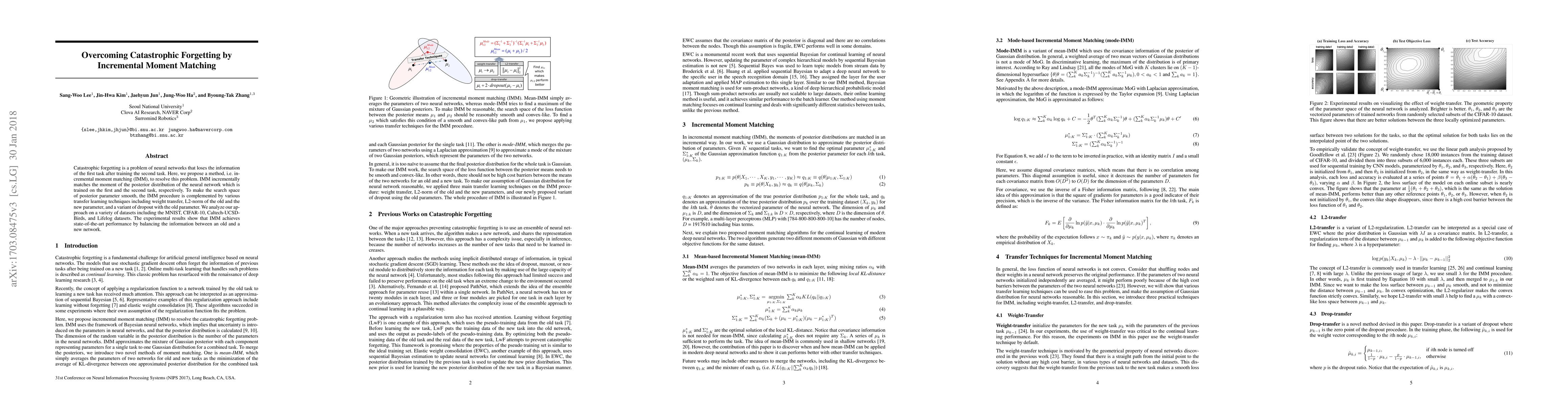 Catastrophic forgetting is a problem of neural networks that loses the information of the first task after training the second task. Here, we propose a method, i.e. incremental moment matching (IMM), to resolve this problem. IMM incrementally matches the moment of the posterior distribution of the neural network which is trained on the first and the second task, respectively. To make the search space of posterior parameter smooth, the IMM procedure is complemented by various transfer learning techniques including weight transfer, L2-norm of the old and the new parameter, and a variant of dropout with the old parameter. We analyze our approach on a variety of datasets including the MNIST, CIFAR-10, Caltech-UCSD-Birds, and Lifelog datasets. The experimental results show that IMM achieves state-of-the-art performance by balancing the information between an old and a new network.