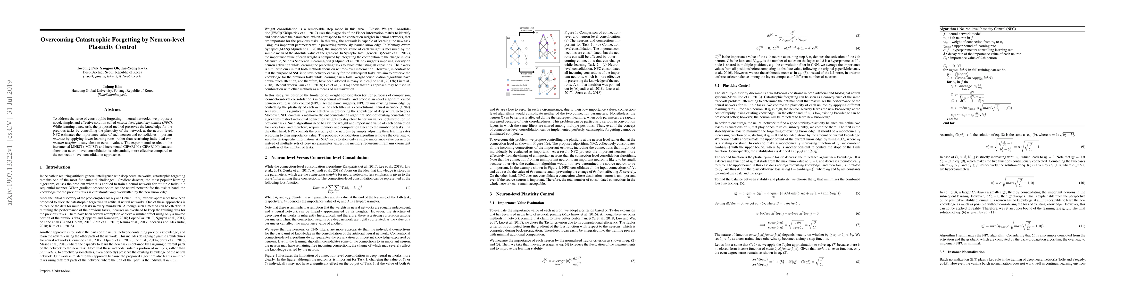 This paper proposes neuron-level plasticity control (NPC) to mitigate catastrophic forgetting in neural networks by preserving previous knowledge during new task learning. NPC consolidates important neurons by applying lower learning rates, demonstrating superior performance over connection-level consolidation methods on iMNIST and iCIFAR100 datasets.