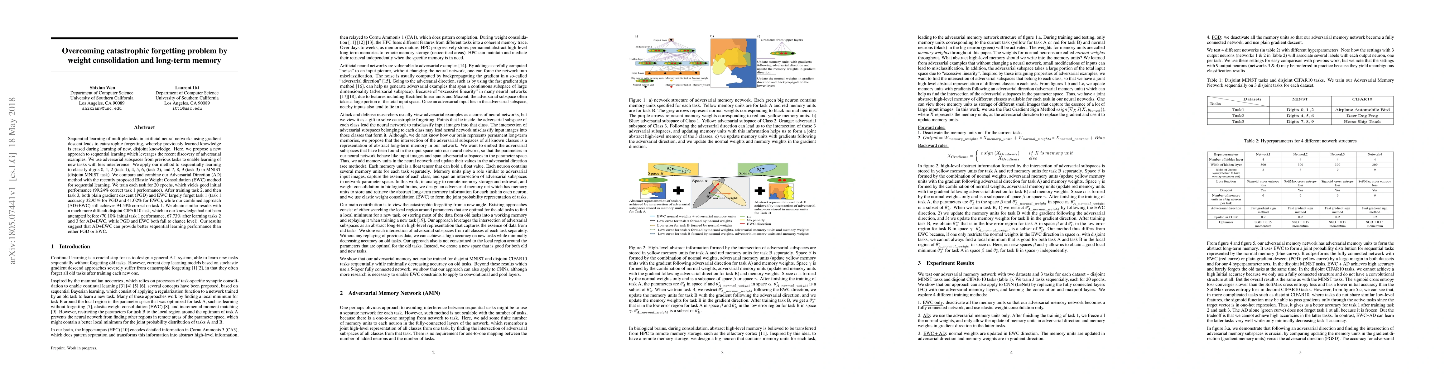 This paper proposes a combined approach using Adversarial Direction (AD) and Elastic Weight Consolidation (EWC) to mitigate catastrophic forgetting in neural networks during sequential learning. The method outperforms plain gradient descent and EWC alone, maintaining high accuracy on previously learned tasks even after learning new, disjoint tasks.