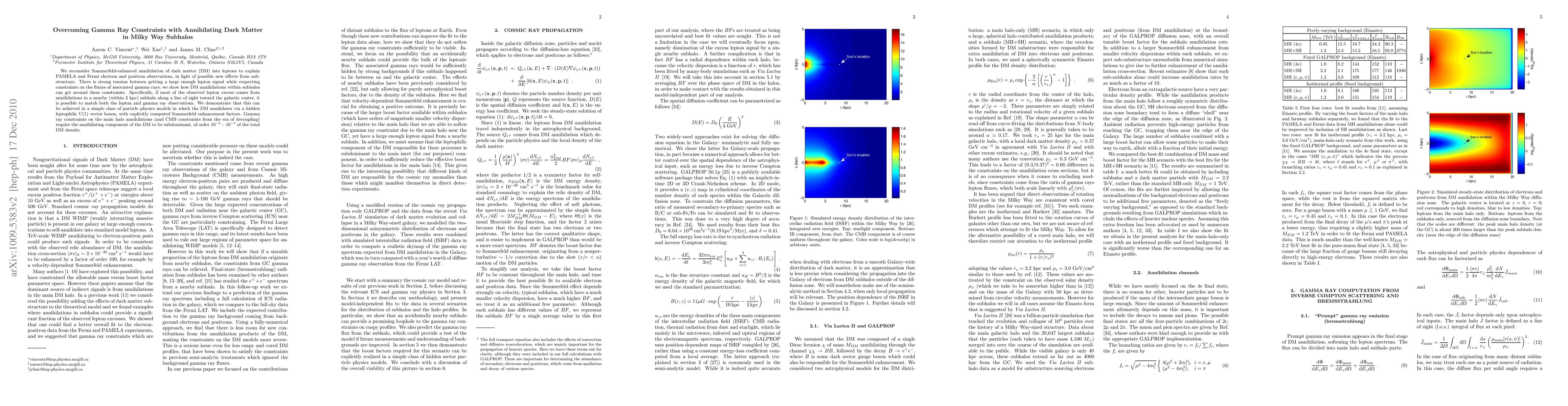 We reconsider Sommerfeld-enhanced annihilation of dark matter (DM) into leptons to explain PAMELA and Fermi electron and positron observations, in light of possible new effects from substructure. There is strong tension between getting a large enough lepton signal while respecting constraints on the fluxes of associated gamma rays. We first show that these constraints become significantly more stringent than in previous studies when the contributions from background e^+ e^- are taken into account, so much so that even cored DM density profiles are ruled out. We then show how DM annihilations within subhalos can get around these constraints. Specifically, if most of the observed lepton excess comes from annihilations in a nearby (within 1 kpc) subhalo along a line of sight toward the galactic center, it is possible to match both the lepton and gamma ray observations. We demonstrate that this can be achieved in a simple class of particle physics models in which the DM annihilates via a hidden leptophilic U(1) vector boson, with explicitly computed Sommerfeld enhancement factors. Gamma ray constraints on the main halo annihilations (and CMB constraints from the era of decoupling) require the annihilating component of the DM to be subdominant, of order 10^-2 of the total DM density.