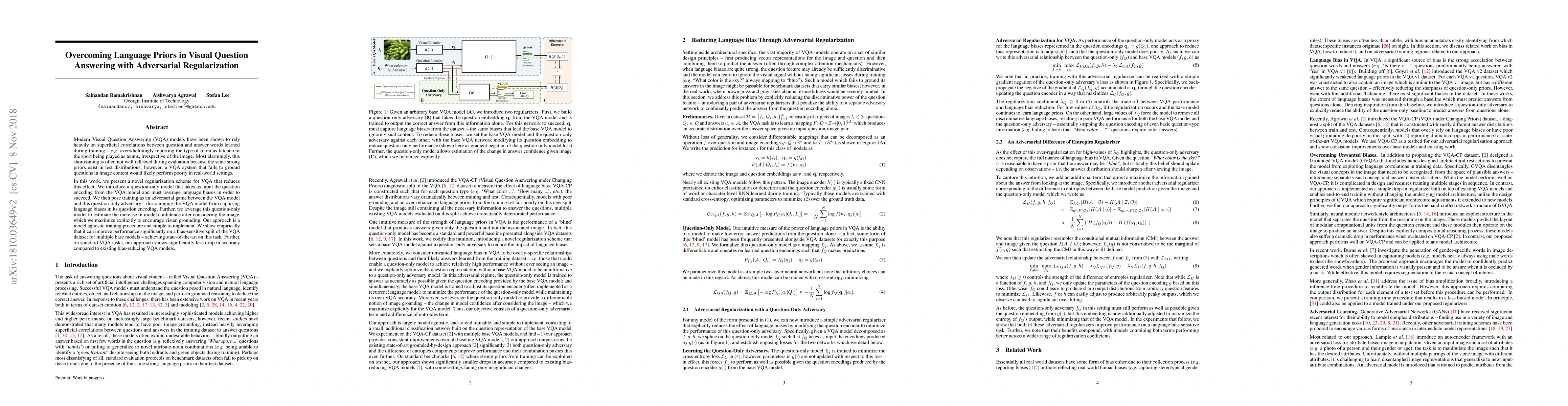 This paper proposes an adversarial regularization scheme to mitigate language priors in Visual Question Answering (VQA) models, which often rely on superficial correlations rather than grounding answers in image content. The method involves training a question-only model to challenge the VQA model, reducing language biases and improving performance on bias-sensitive tasks.