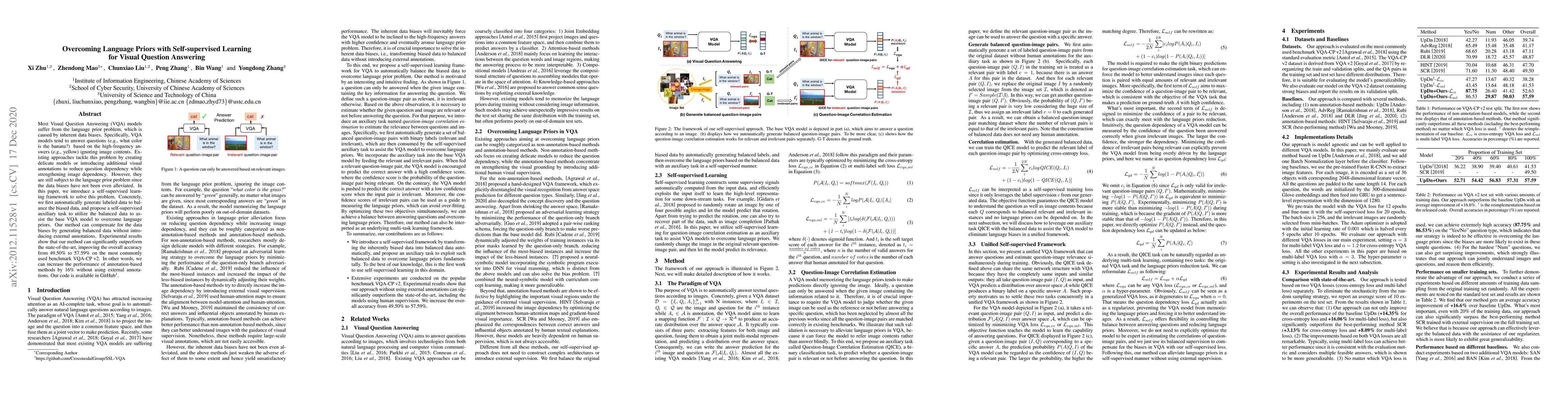 This paper proposes a self-supervised learning framework to address the language prior problem in Visual Question Answering (VQA) models, which biases answers towards high-frequency responses. The method generates balanced labeled data and uses a self-supervised auxiliary task to improve model performance, achieving a 16% accuracy increase on the VQA-CP v2 benchmark without external annotations.
