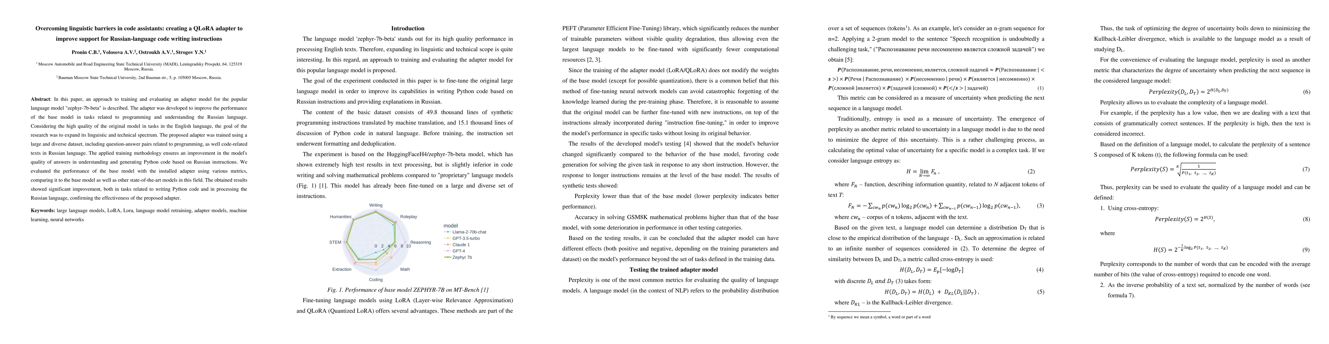 In this paper, an approach to training and evaluating an adapter model for the popular language model "zephyr-7b-beta" is described. The adapter was developed to improve the performance of the base model in tasks related to programming and understanding the Russian language. Considering the high quality of the original model in tasks in the English language, the goal of the research was to expand its linguistic and technical spectrum. The proposed adapter was trained using a large and diverse dataset, including question-answer pairs related to programming, as well code-related texts in Russian language. The applied training methodology ensures an improvement in the model's quality of answers in understanding and generating Python code based on Russian instructions. We evaluated the performance of the base model with the installed adapter using various metrics, comparing it to the base model as well as other state-of-the-art models in this field. The obtained results showed significant improvement, both in tasks related to writing Python code and in processing the Russian language, confirming the effectiveness of the proposed adapter.