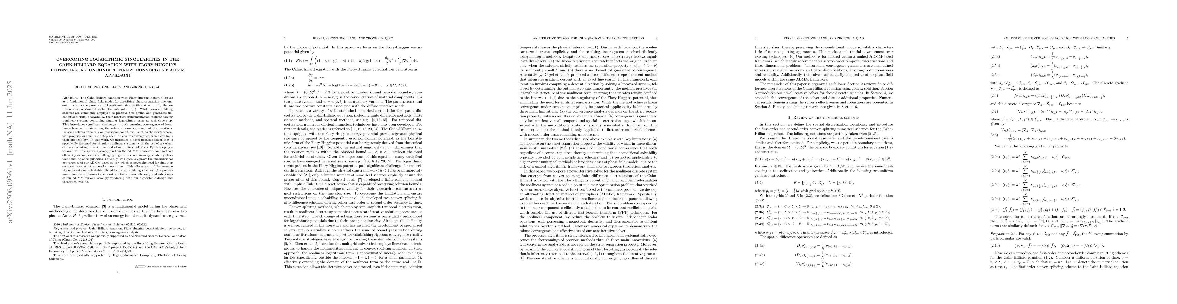 This research introduces an innovative ADMM-based iterative solver to tackle logarithmic singularities in the Cahn-Hilliard equation with Flory-Huggins potential, ensuring unconditional convergence without restrictive conditions like small time steps or strict separation properties. Numerical experiments validate the superior efficiency and robustness of the proposed method.