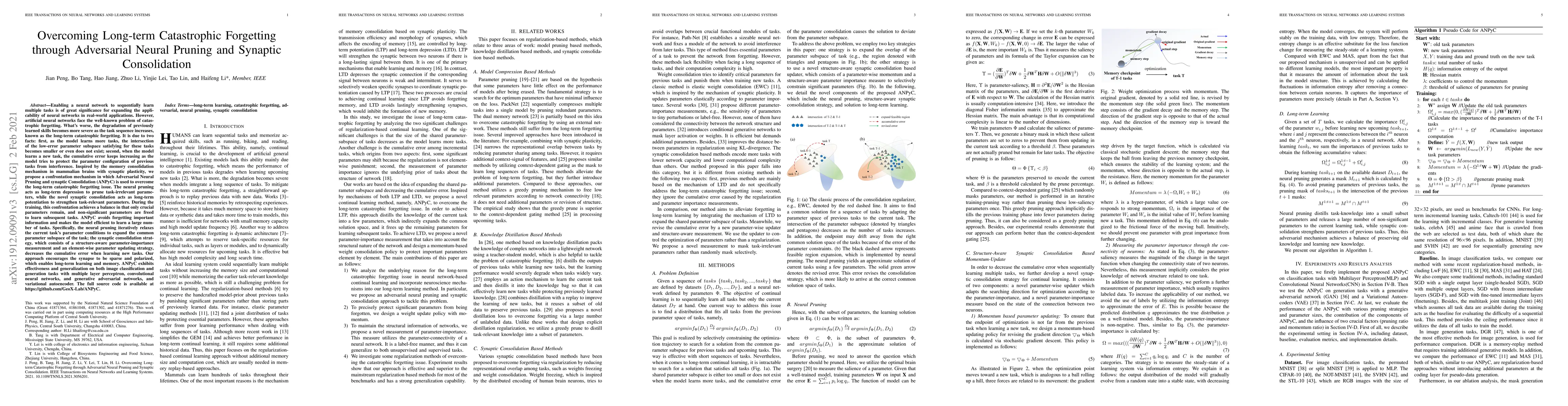 This paper proposes a method called Adversarial Neural Pruning and Synaptic Consolidation (ANPyC) to tackle long-term catastrophic forgetting in neural networks. It combines neural pruning to remove irrelevant parameters and synaptic consolidation to enhance important ones, achieving a balance that allows efficient learning of multiple tasks without significant loss of previously learned skills.