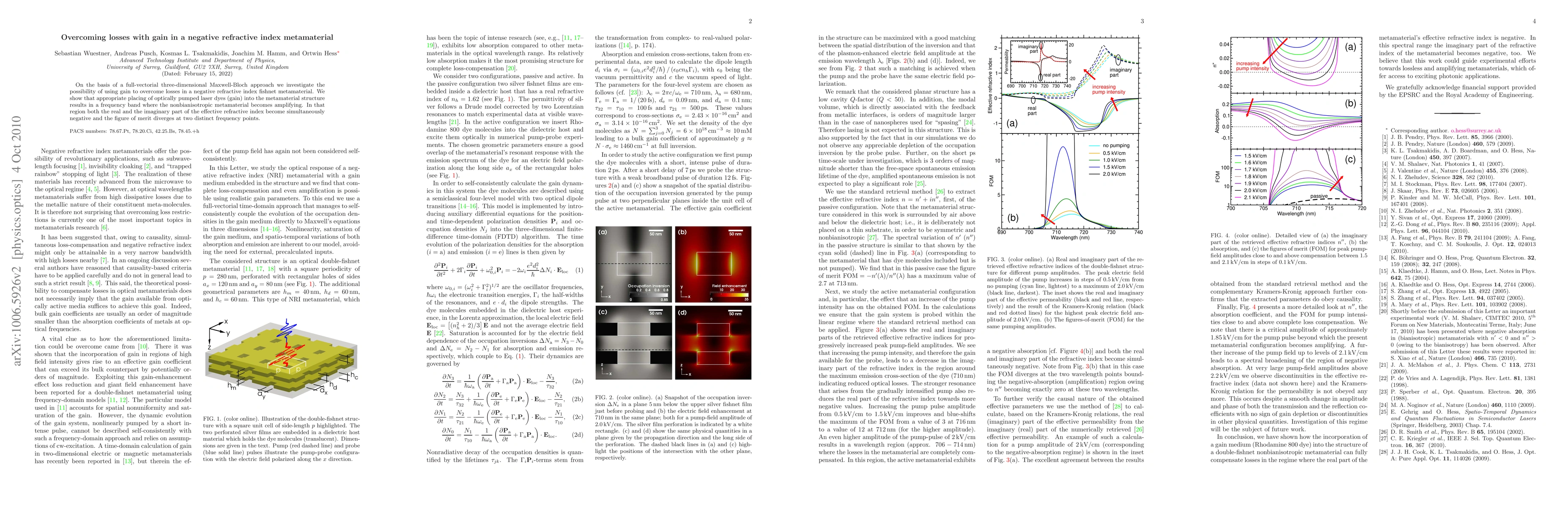 This paper explores the use of gain from optically pumped laser dyes to counteract losses in a negative refractive index fishnet metamaterial, demonstrating that strategic placement of gain can create an amplifying frequency band where both the real and imaginary parts of the effective refractive index become negative.