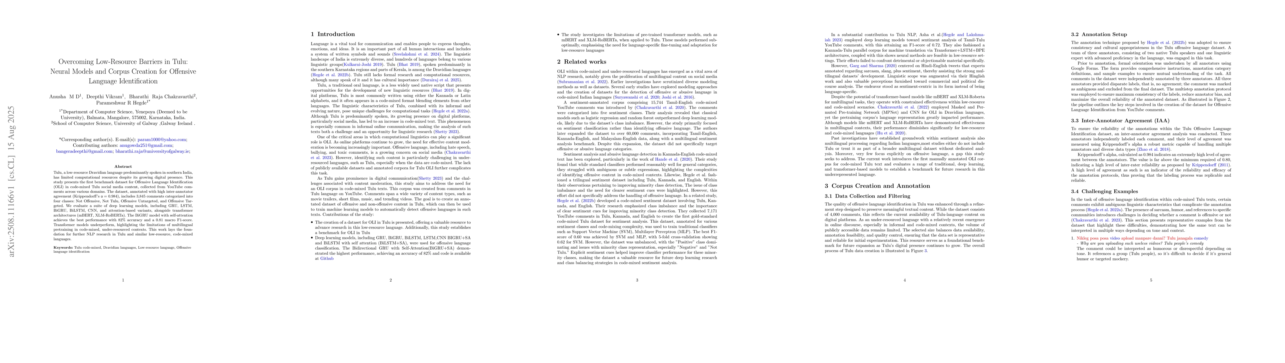 Tulu, a low-resource Dravidian language predominantly spoken in southern India, has limited computational resources despite its growing digital presence. This study presents the first benchmark dataset for Offensive Language Identification (OLI) in code-mixed Tulu social media content, collected from YouTube comments across various domains. The dataset, annotated with high inter-annotator agreement (Krippendorff's alpha = 0.984), includes 3,845 comments categorized into four classes: Not Offensive, Not Tulu, Offensive Untargeted, and Offensive Targeted. We evaluate a suite of deep learning models, including GRU, LSTM, BiGRU, BiLSTM, CNN, and attention-based variants, alongside transformer architectures (mBERT, XLM-RoBERTa). The BiGRU model with self-attention achieves the best performance with 82% accuracy and a 0.81 macro F1-score. Transformer models underperform, highlighting the limitations of multilingual pretraining in code-mixed, under-resourced contexts. This work lays the foundation for further NLP research in Tulu and similar low-resource, code-mixed languages.