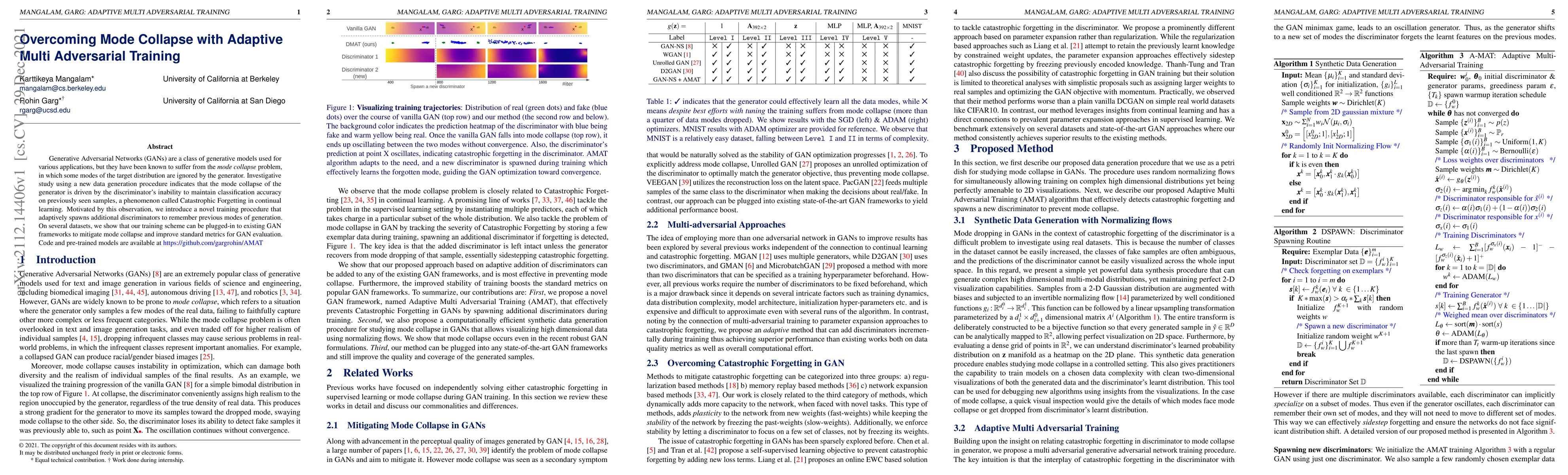 This paper proposes an adaptive multi-adversarial training method to tackle mode collapse in Generative Adversarial Networks (GANs) by introducing additional discriminators to remember previously generated modes, thereby improving GAN performance metrics. The approach effectively addresses the issue of Catastrophic Forgetting in the discriminator.