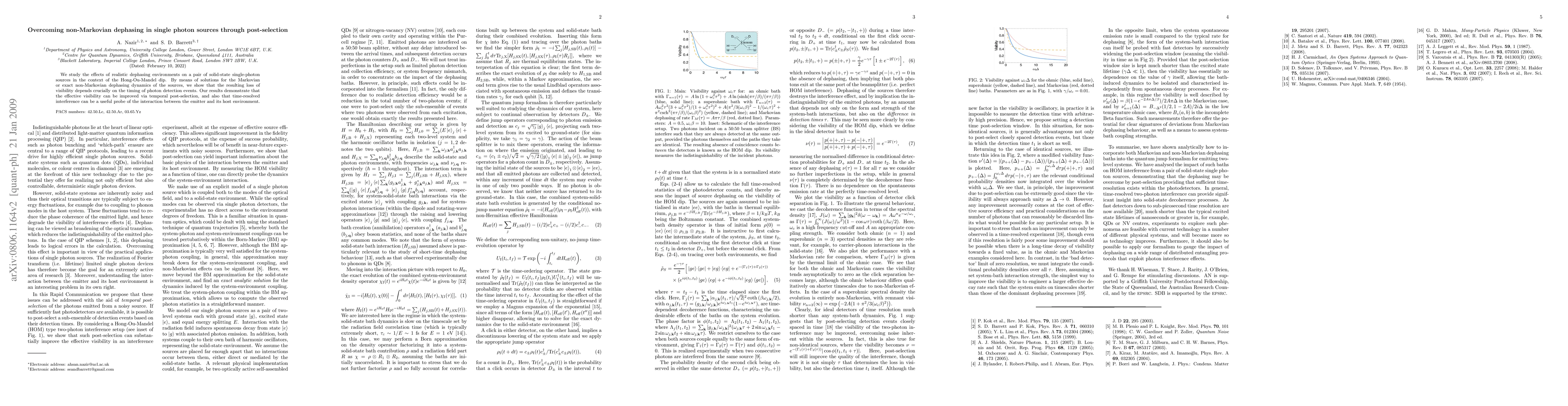 This paper investigates how non-Markovian dephasing affects solid-state single-photon sources, showing that visibility loss in the Hong-Ou-Mandel dip is timing-dependent. It demonstrates that post-selection based on photon detection timing can enhance effective visibility and suggests time-resolved interference as a probe for emitter-environment interactions.