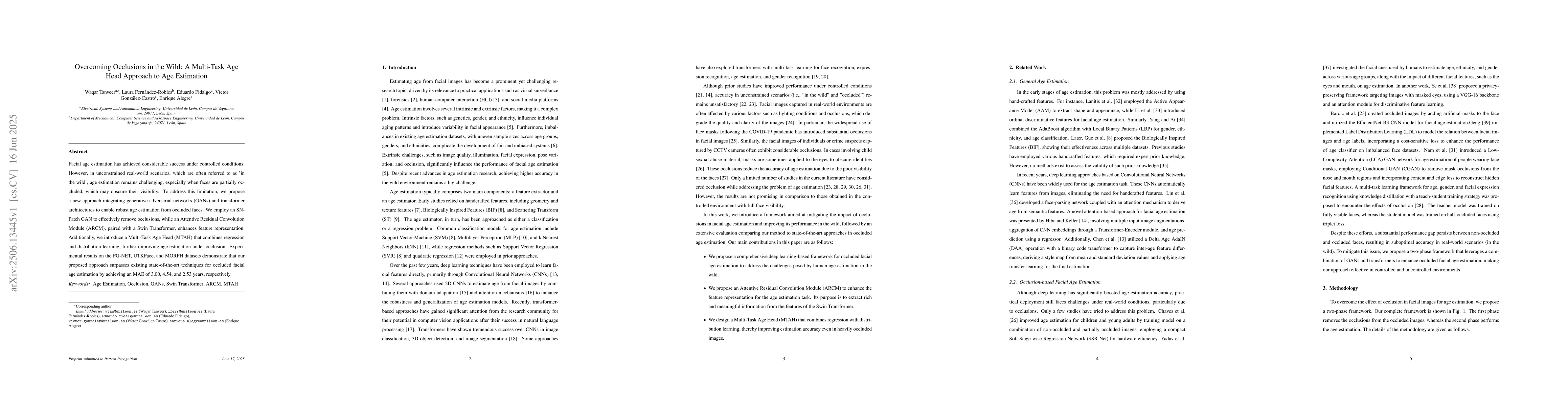 Facial age estimation has achieved considerable success under controlled conditions. However, in unconstrained real-world scenarios, which are often referred to as 'in the wild', age estimation remains challenging, especially when faces are partially occluded, which may obscure their visibility. To address this limitation, we propose a new approach integrating generative adversarial networks (GANs) and transformer architectures to enable robust age estimation from occluded faces. We employ an SN-Patch GAN to effectively remove occlusions, while an Attentive Residual Convolution Module (ARCM), paired with a Swin Transformer, enhances feature representation. Additionally, we introduce a Multi-Task Age Head (MTAH) that combines regression and distribution learning, further improving age estimation under occlusion. Experimental results on the FG-NET, UTKFace, and MORPH datasets demonstrate that our proposed approach surpasses existing state-of-the-art techniques for occluded facial age estimation by achieving an MAE of $3.00$, $4.54$, and $2.53$ years, respectively.