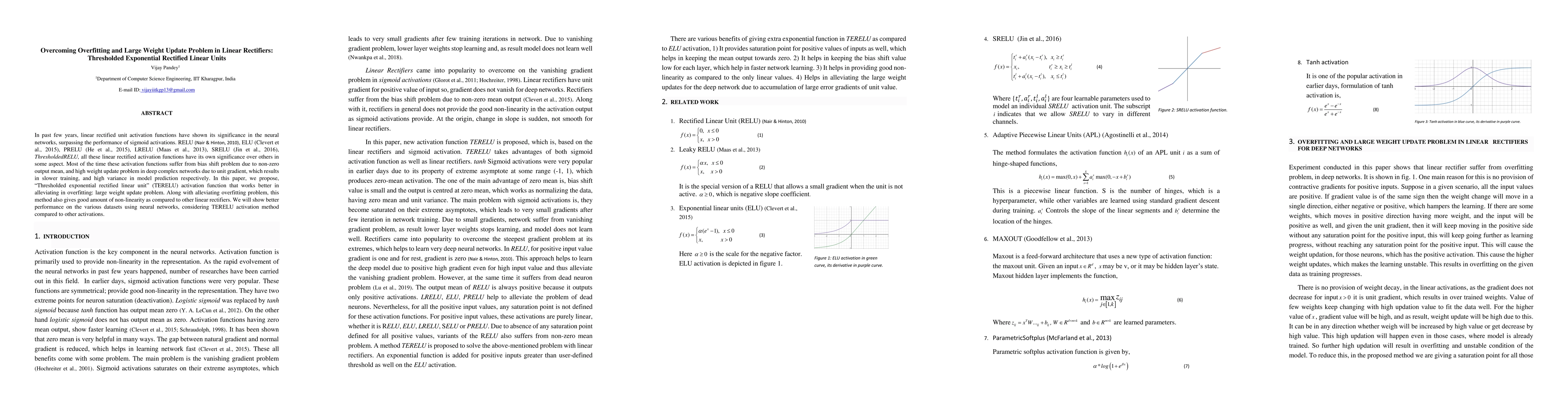 In past few years, linear rectified unit activation functions have shown its significance in the neural networks, surpassing the performance of sigmoid activations. RELU (Nair & Hinton, 2010), ELU (Clevert et al., 2015), PRELU (He et al., 2015), LRELU (Maas et al., 2013), SRELU (Jin et al., 2016), ThresholdedRELU, all these linear rectified activation functions have its own significance over others in some aspect. Most of the time these activation functions suffer from bias shift problem due to non-zero output mean, and high weight update problem in deep complex networks due to unit gradient, which results in slower training, and high variance in model prediction respectively. In this paper, we propose, "Thresholded exponential rectified linear unit" (TERELU) activation function that works better in alleviating in overfitting: large weight update problem. Along with alleviating overfitting problem, this method also gives good amount of non-linearity as compared to other linear rectifiers. We will show better performance on the various datasets using neural networks, considering TERELU activation method compared to other activations.