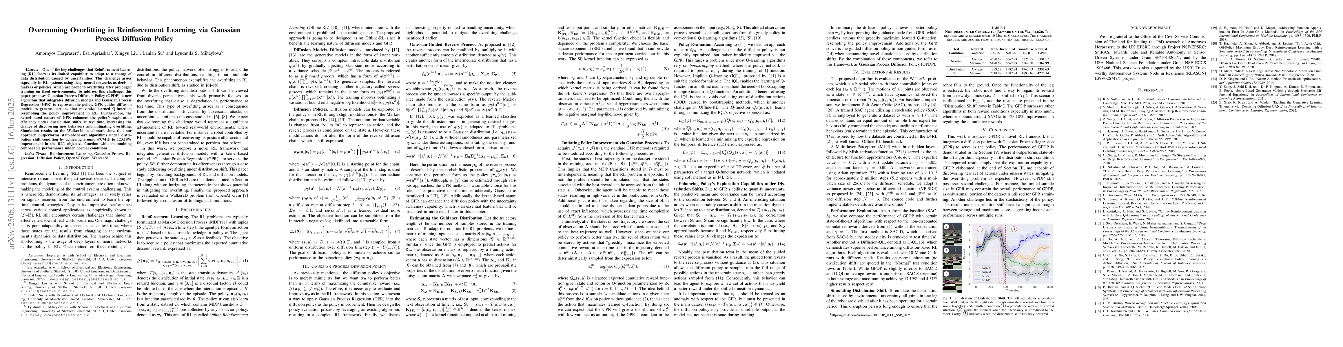 One of the key challenges that Reinforcement Learning (RL) faces is its limited capability to adapt to a change of data distribution caused by uncertainties. This challenge arises especially in RL systems using deep neural networks as decision makers or policies, which are prone to overfitting after prolonged training on fixed environments. To address this challenge, this paper proposes Gaussian Process Diffusion Policy (GPDP), a new algorithm that integrates diffusion models and Gaussian Process Regression (GPR) to represent the policy. GPR guides diffusion models to generate actions that maximize learned Q-function, resembling the policy improvement in RL. Furthermore, the kernel-based nature of GPR enhances the policy's exploration efficiency under distribution shifts at test time, increasing the chance of discovering new behaviors and mitigating overfitting. Simulation results on the Walker2d benchmark show that our approach outperforms state-of-the-art algorithms under distribution shift condition by achieving around 67.74% to 123.18% improvement in the RL's objective function while maintaining comparable performance under normal conditions.
