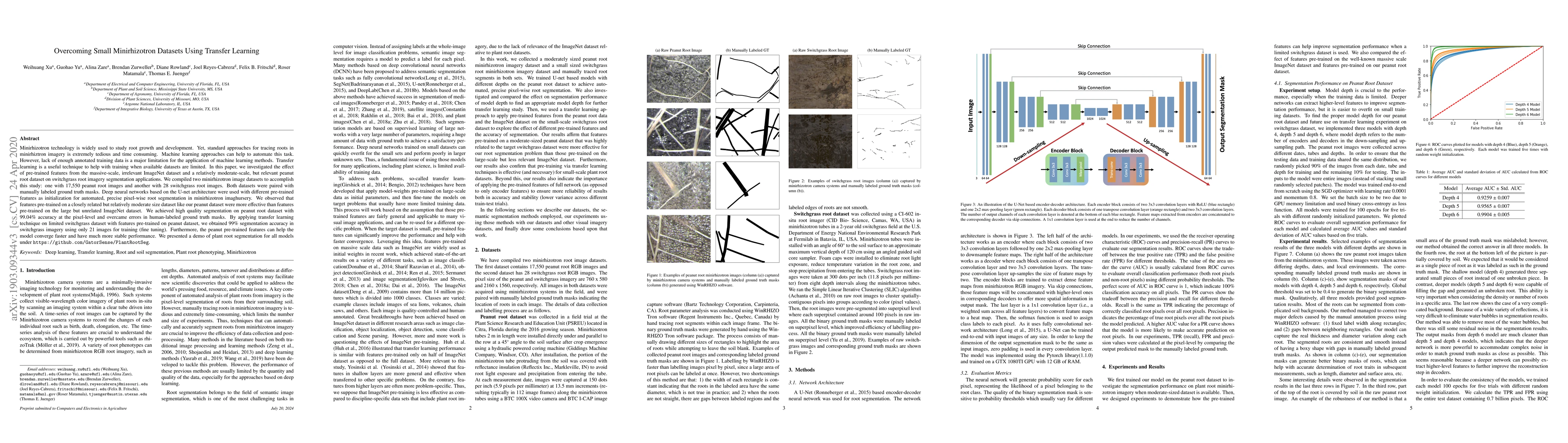 Minirhizotron technology is widely used for studying the development of roots. Such systems collect visible-wavelength color imagery of plant roots in-situ by scanning an imaging system within a clear tube driven into the soil. Automated analysis of root systems could facilitate new scientific discoveries that would be critical to address the world's pressing food, resource, and climate issues. A key component of automated analysis of plant roots from imagery is the automated pixel-level segmentation of roots from their surrounding soil. Supervised learning techniques appear to be an appropriate tool for the challenge due to varying local soil and root conditions, however, lack of enough annotated training data is a major limitation due to the error-prone and time-consuming manually labeling process. In this paper, we investigate the use of deep neural networks based on the U-net architecture for automated, precise pixel-wise root segmentation in minirhizotron imagery. We compiled two minirhizotron image datasets to accomplish this study: one with 17,550 peanut root images and another with 28 switchgrass root images. Both datasets were paired with manually labeled ground truth masks. We trained three neural networks with different architectures on the larger peanut root dataset to explore the effect of the neural network depth on segmentation performance. To tackle the more limited switchgrass root dataset, we showed that models initialized with features pre-trained on the peanut dataset and then fine-tuned on the switchgrass dataset can improve segmentation performance significantly. We obtained 99\% segmentation accuracy in switchgrass imagery using only 21 training images. We also observed that features pre-trained on a closely related but relatively moderate size dataset like our peanut dataset are more effective than features pre-trained on the large but unrelated ImageNet dataset.
