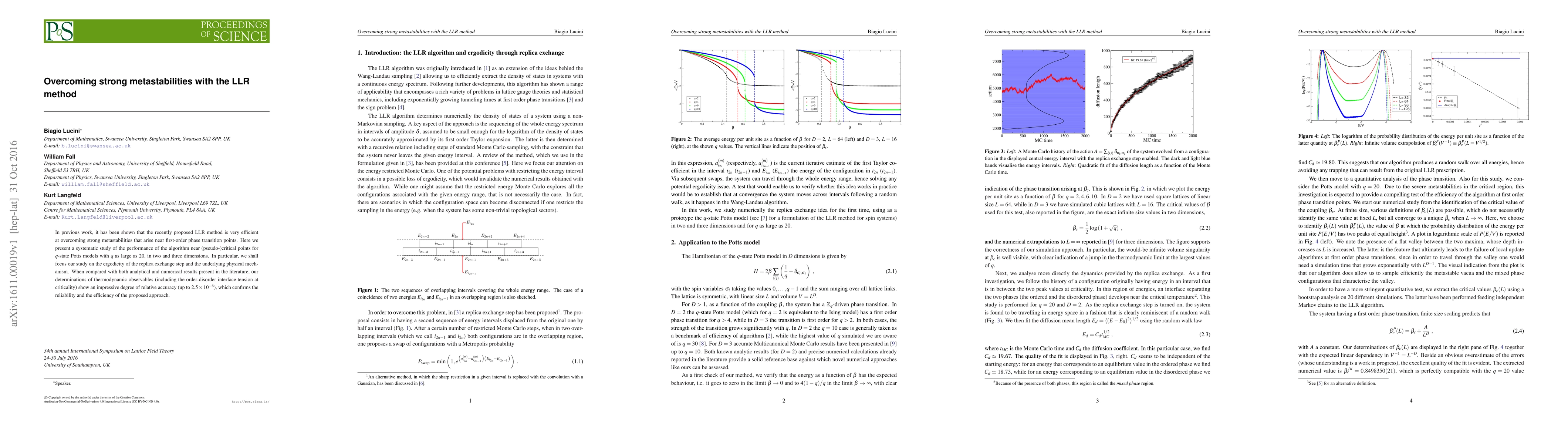 This paper investigates the LLR method's efficacy in overcoming strong metastabilities near first-order phase transitions in $q$-state Potts models, achieving high accuracy in thermodynamic observables, and confirming its reliability and efficiency through comparisons with analytical and numerical results. The study focuses on the ergodicity of the replica exchange step and the underlying physical mechanisms.
