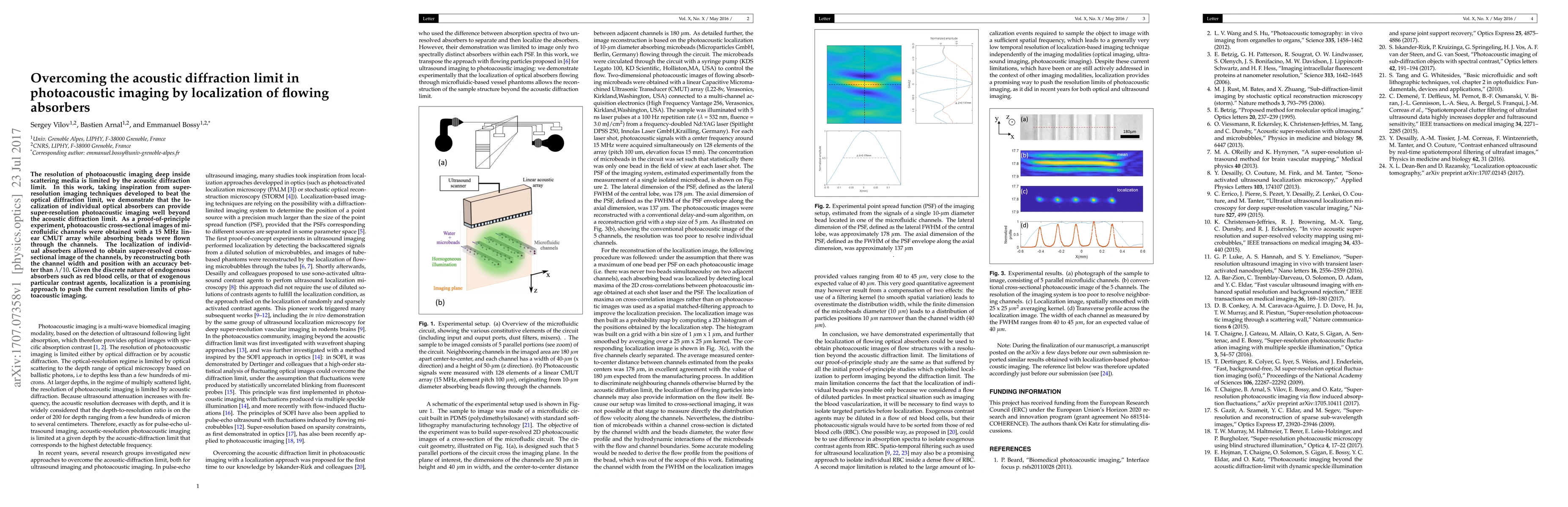 This paper demonstrates a method to surpass the acoustic diffraction limit in photoacoustic imaging by localizing flowing optical absorbers, achieving super-resolution imaging. Using a 15 MHz CMUT array and flowing absorbing beads, the technique reconstructs microfluidic channel cross-sections with sub-wavelength accuracy, suggesting potential for enhancing the resolution of endogenous and exogenous contrast agents in photoacoustic imaging.