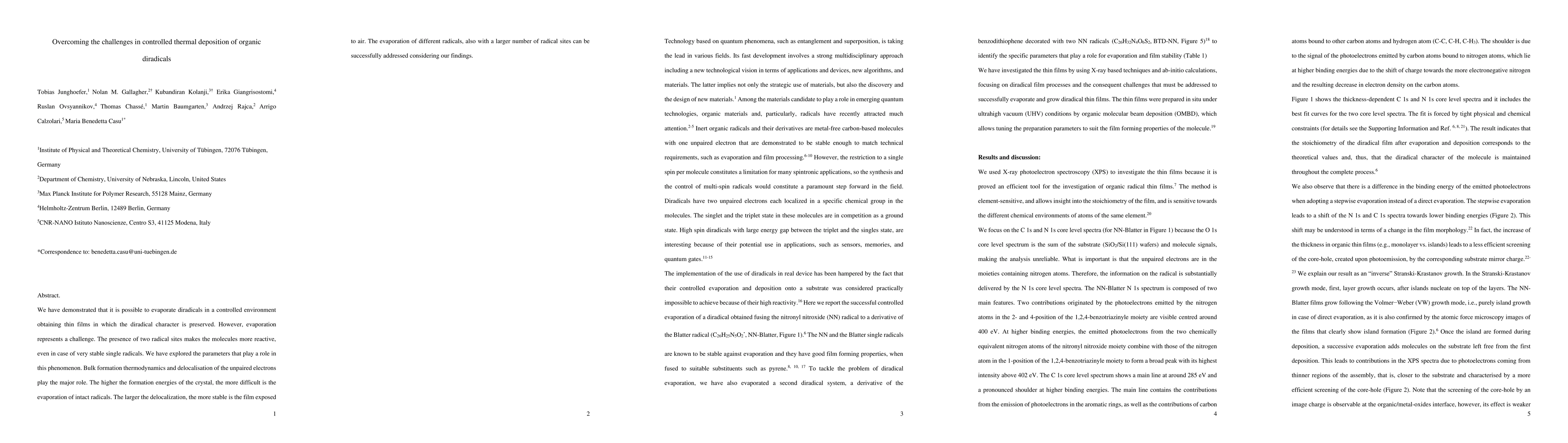 We have demonstrated that it is possible to evaporate diradicals in a controlled environment obtaining thin films in which the diradical character is preserved. However, evaporation represents a challenge. The presence of two radical sites makes the molecules more reactive, even in case of very stable single radicals. We have explored the parameters that play a role in this phenomenon. Bulk formation thermodynamics and delocalisation of the unpaired electrons play the major role. The higher the formation energies of the crystal, the more difficult is the evaporation of intact radicals. The larger the delocalization, the more stable is the film exposed to air. The evaporation of different radicals, also with a larger number of radical sites can be successfully addressed considering our findings.