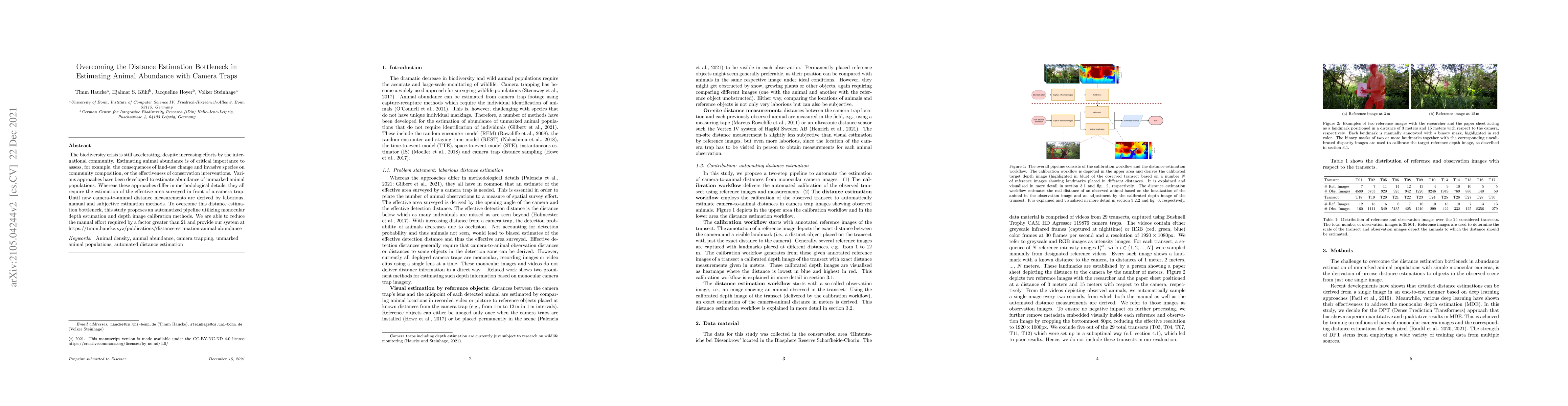 The biodiversity crisis is still accelerating, despite increasing efforts by the international community. Estimating animal abundance is of critical importance to assess, for example, the consequences of land-use change and invasive species on community composition, or the effectiveness of conservation interventions. Various approaches have been developed to estimate abundance of unmarked animal populations. Whereas these approaches differ in methodological details, they all require the estimation of the effective area surveyed in front of a camera trap. Until now camera-to-animal distance measurements are derived by laborious, manual and subjective estimation methods. To overcome this distance estimation bottleneck, this study proposes an automatized pipeline utilizing monocular depth estimation and depth image calibration methods. We are able to reduce the manual effort required by a factor greater than 21 and provide our system at https://timm.haucke.xyz/publications/distance-estimation-animal-abundance