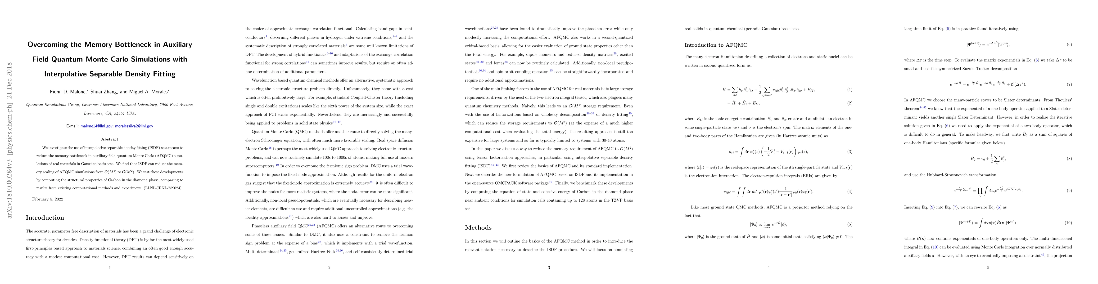 This paper explores the use of interpolative separable density fitting (ISDF) to mitigate memory issues in auxiliary field quantum Monte Carlo (AFQMC) simulations, reducing memory scaling from $\mathcal{O}(M^4)$ to $\mathcal{O}(M^2)$. The effectiveness of ISDF is demonstrated through the computation of structural properties of diamond phase carbon.