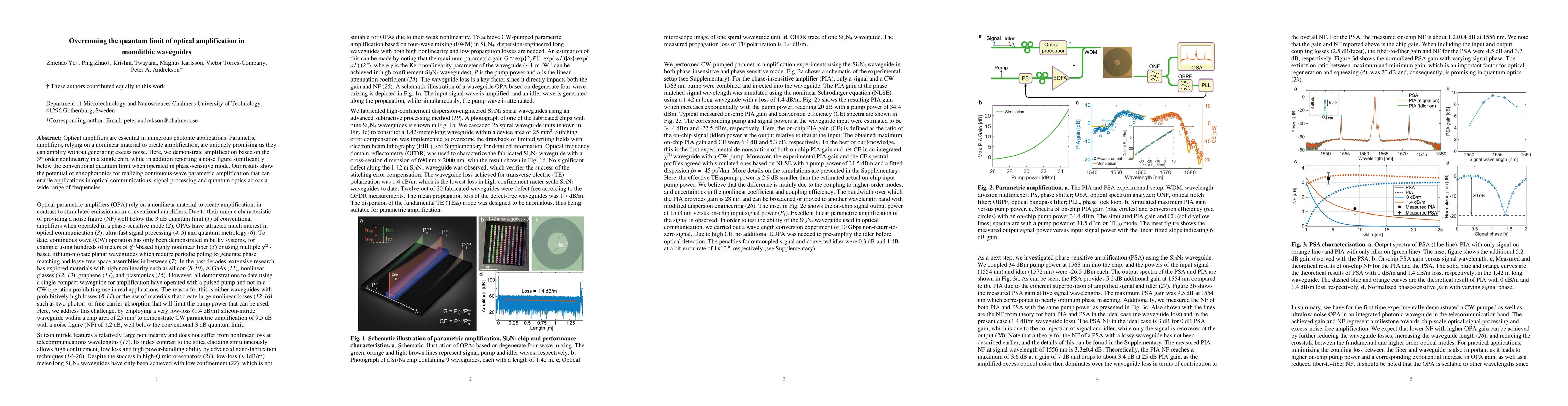 This paper demonstrates a novel optical amplifier using third-order nonlinearity in a monolithic waveguide, achieving amplification with a noise figure below the quantum limit. The findings highlight the potential of nanophotonics for applications in optical communications, signal processing, and quantum optics.