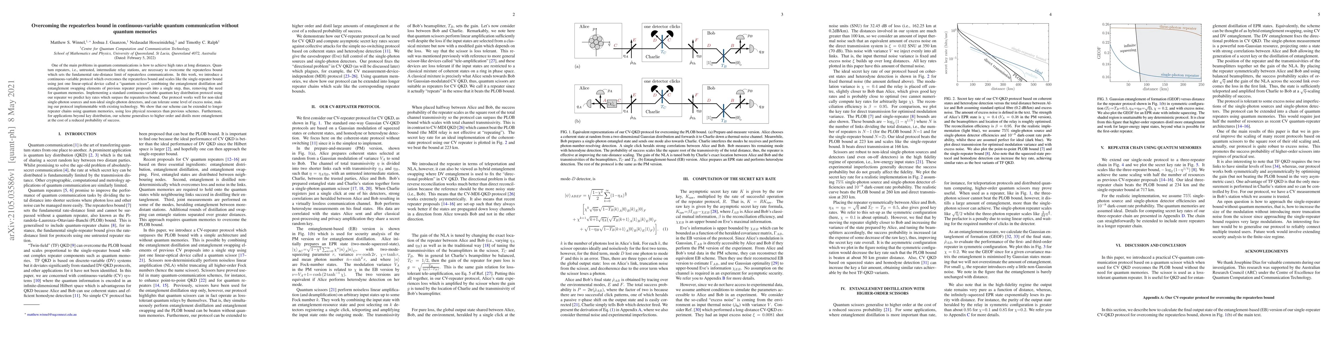 This paper proposes a continuous-variable quantum communication protocol that overcomes the repeaterless bound without requiring quantum memories, using a single linear-optical device called a "quantum scissor." The protocol combines entanglement distillation and swapping into one step, achieving scalability similar to that of a single quantum repeater.