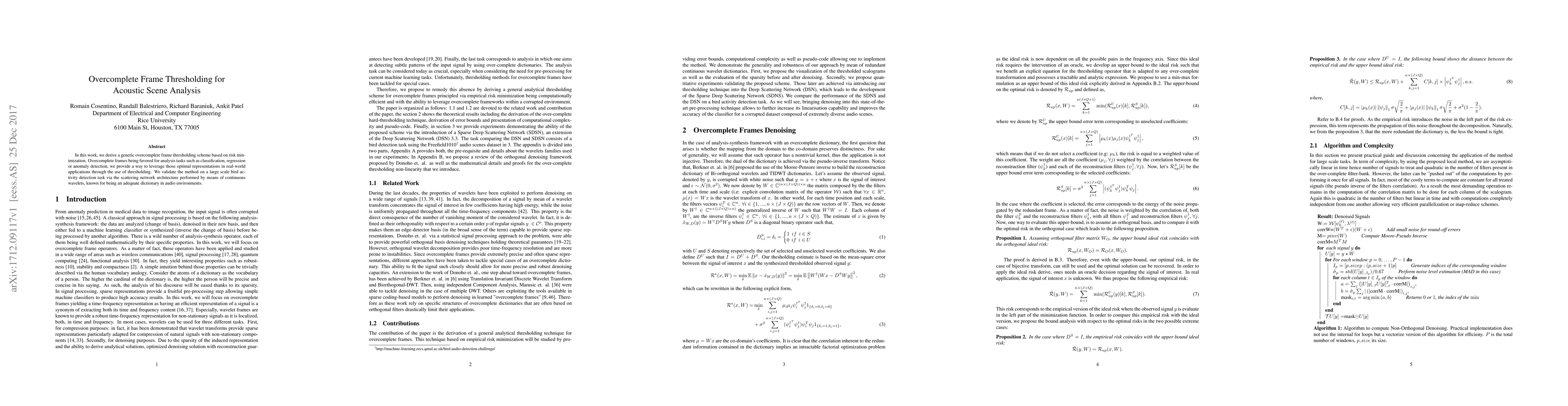 This paper proposes an overcomplete frame thresholding scheme based on risk minimization for acoustic scene analysis, demonstrating its effectiveness in a large-scale bird activity detection task using scattering networks and continuous wavelets. The method leverages optimal representations for classification, regression, and anomaly detection in real-world applications.