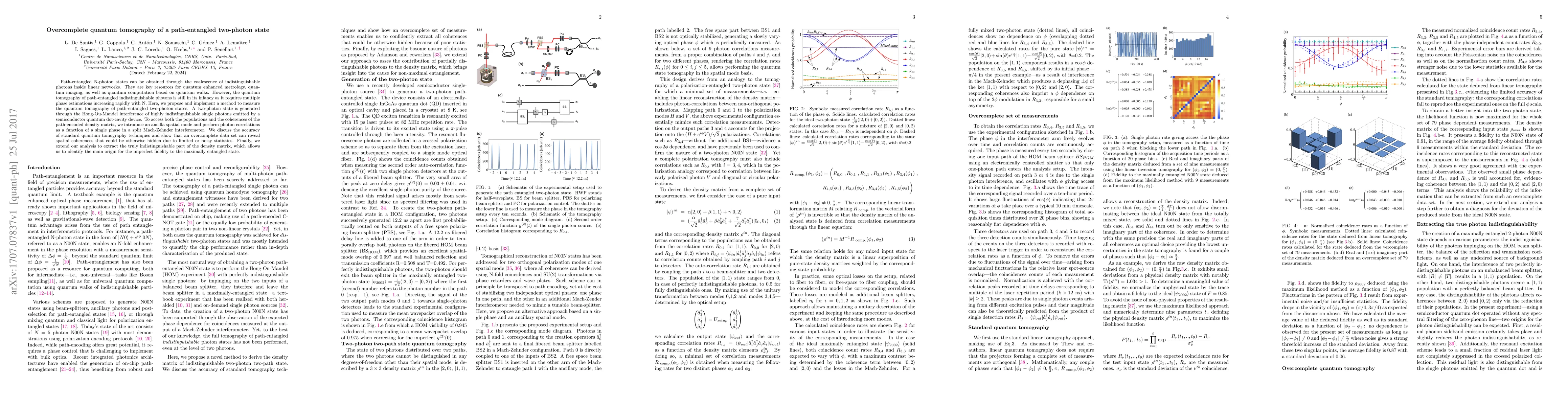 Path-entangled N-photon states can be obtained through the coalescence of indistinguishable photons inside linear networks. They are key resources for quantum enhanced metrology, quantum imaging, as well as quantum computation based on quantum walks. However, the quantum tomography of path-entangled indistinguishable photons is still in its infancy as it requires multiple phase estimations increasing rapidly with N. Here, we propose and implement a method to measure the quantum tomography of path-entangled two-photon states. A two-photon state is generated through the Hong-Ou-Mandel interference of highly indistinguishable single photons emitted by a semiconductor quantum dot-cavity device. To access both the populations and the coherences of the path-encoded density matrix, we introduce an ancilla spatial mode and perform photon correlations as a function of a single phase in a split Mach-Zehnder interferometer. We discuss the accuracy of standard quantum tomography techniques and show that an overcomplete data set can reveal spatial coherences that could be otherwise hidden due to limited or noisy statistics. Finally, we extend our analysis to extract the truly indistinguishable part of the density matrix, which allows us to identify the main origin for the imperfect fidelity to the maximally entangled state.