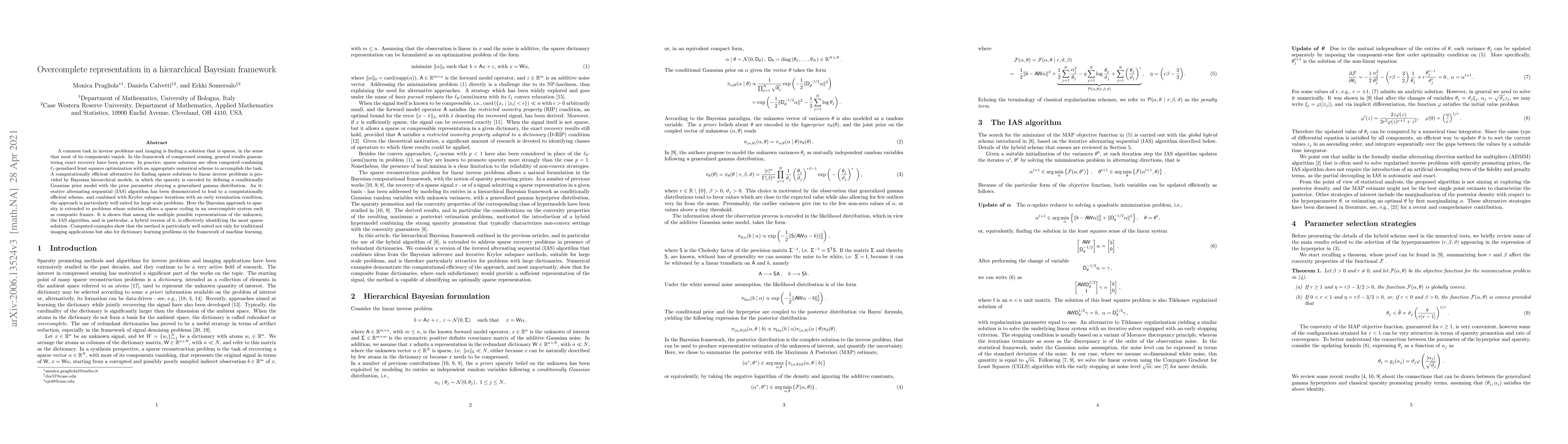 A common task in inverse problems and imaging is finding a solution that is sparse, in the sense that most of its components vanish. In the framework of compressed sensing, general results guaranteeing exact recovery have been proven. In practice, sparse solutions are often computed combining $\ell_1$-penalized least squares optimization with an appropriate numerical scheme to accomplish the task. A computationally efficient alternative for finding sparse solutions to linear inverse problems is provided by Bayesian hierarchical models, in which the sparsity is encoded by defining a conditionally Gaussian prior model with the prior parameter obeying a generalized gamma distribution. An iterative alternating sequential (IAS) algorithm has been demonstrated to lead to a computationally efficient scheme, and combined with Krylov subspace iterations with an early termination condition, the approach is particularly well suited for large scale problems. Here the Bayesian approach to sparsity is extended to problems whose solution allows a sparse coding in an overcomplete system such as composite frames. It is shown that among the multiple possible representations of the unknown, the IAS algorithm, and in particular, a hybrid version of it, is effectively identifying the most sparse solution. Computed examples show that the method is particularly well suited not only for traditional imaging applications but also for dictionary learning problems in the framework of machine learning.