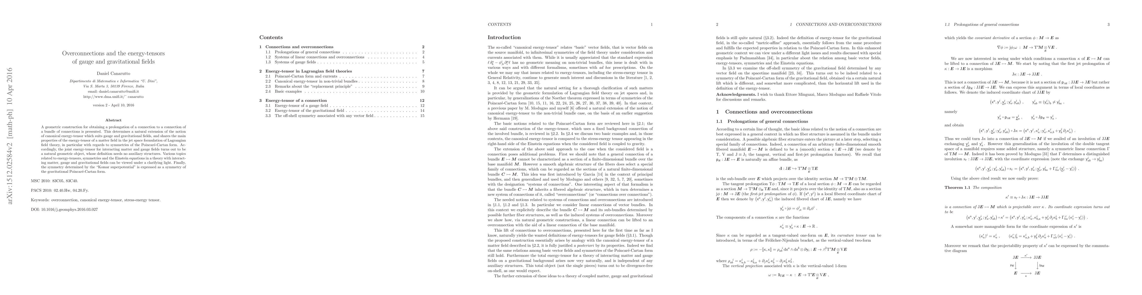 A geometric construction for obtaining a prolongation of a connection to a connection of a bundle of connections is presented. This determines a natural extension of the notion of canonical energy-tensor which suits gauge and gravitational fields, and shares the main properties of the energy-tensor of a matter field in the jet space formulation of Lagrangian field theory, in particular with regards to symmetries of the Poincar\'e-Cartan form. Accordingly, the joint energy-tensor for interacting matter and gauge fields turns out to be a natural geometric object, whose definition needs no auxuliary structures. Various topics related to energy-tensors, symmetries and the Einstein equations in a theory with interacting matter, gauge and gravitational fields can be viewed under a clarifying light. Finally, the symmetry determined by the "Komar superpotential" is expressed as a symmetry of the gravitational Poincar\'e-Cartan form.